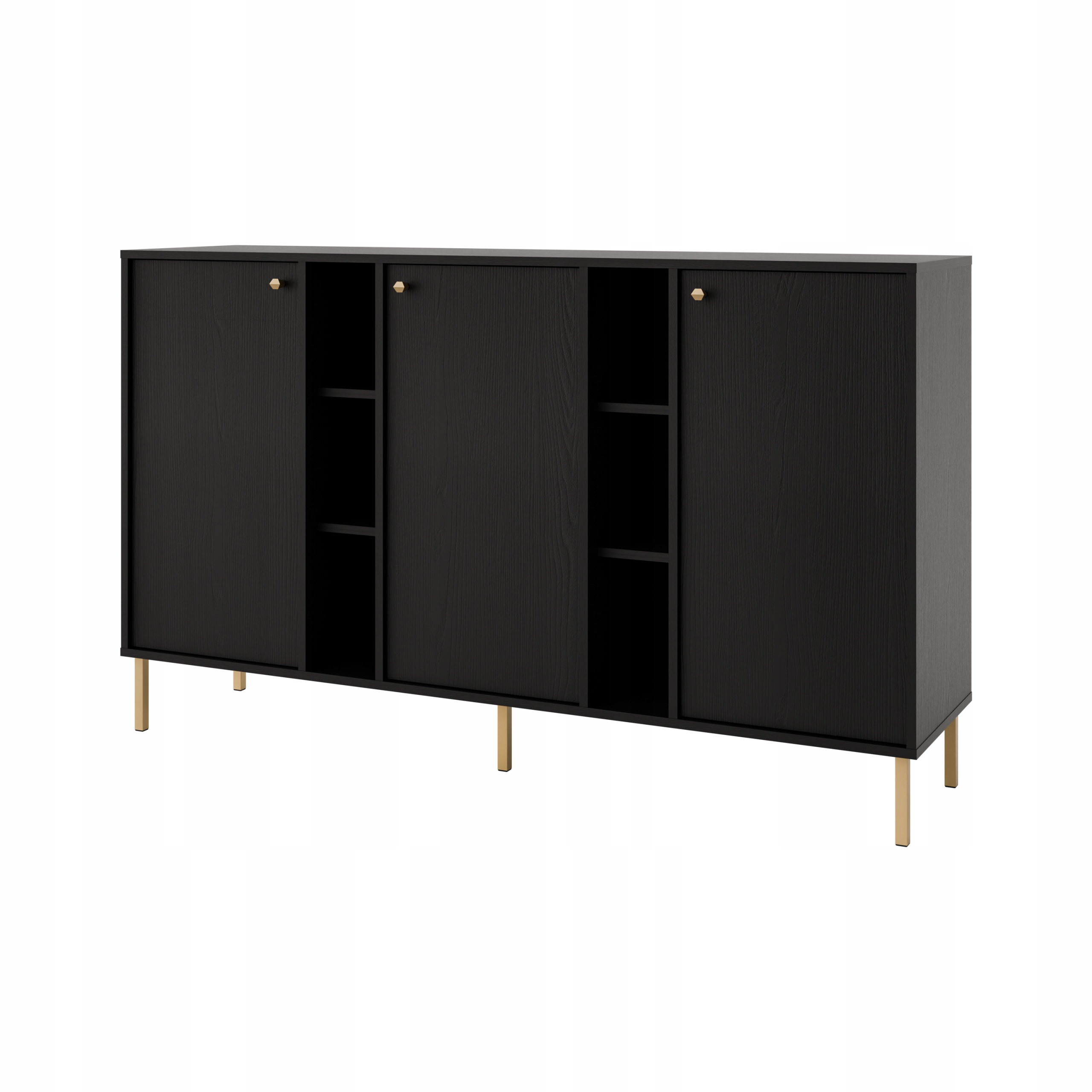 Mebel wyposażony jest w 3 frontowe szafki z półkami oraz wnękami, które mogą posłużyć również jako półki dekoracyjne.