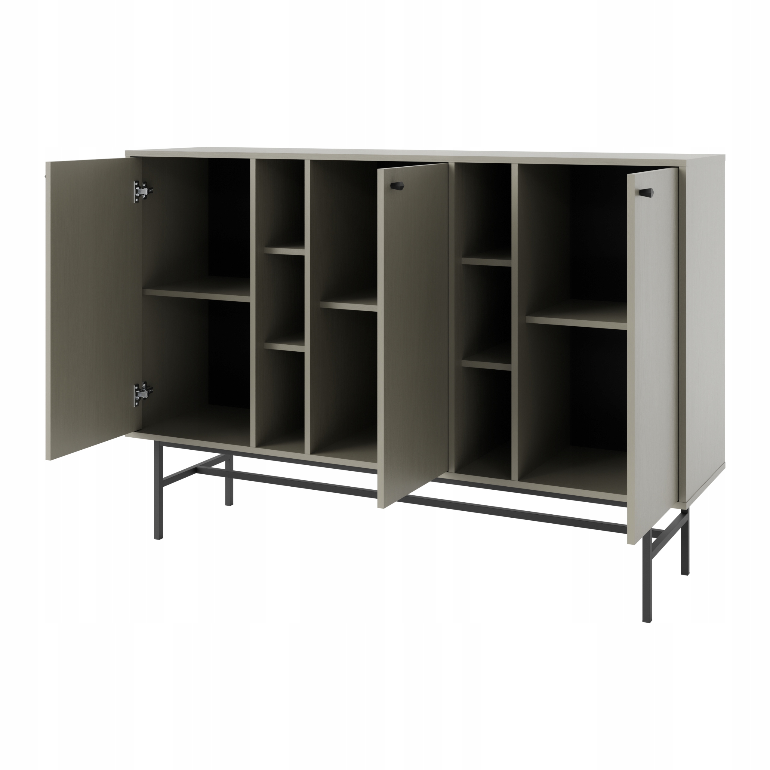 Mebel wyposażony jest w 3 frontowe szafki z półkami oraz wnękami, które mogą posłużyć również jako półki dekoracyjne.