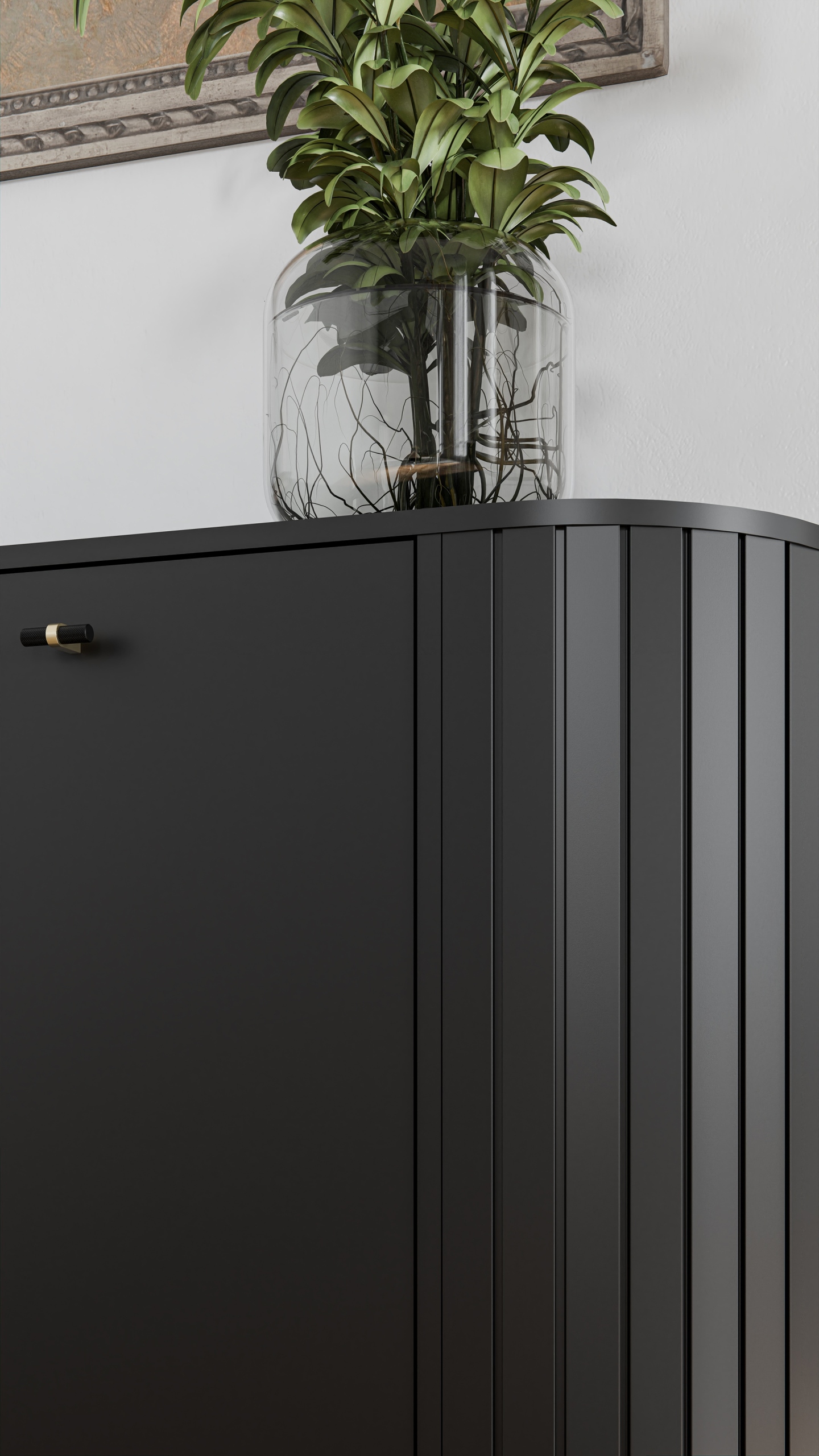 Komoda z szufladami i drzwiczkami to praktyczny i elegancki mebel o nowoczesnej formie, który doskonale sprawdzi się w salonie, jadalni lub sypialni. Charakterystyczne pionowe frezowania na bokach oraz zaokrąglone krawędzie nadają jej subtelny, nowoczesny wygląd. Komoda wyposażona jest w dwie szafki boczne z półkami, trzy pojemne szuflady umieszczone centralnie. Stabilna konstrukcja wsparta jest na metalowych nogach z dekoracyjnym złotym zakończeniem.