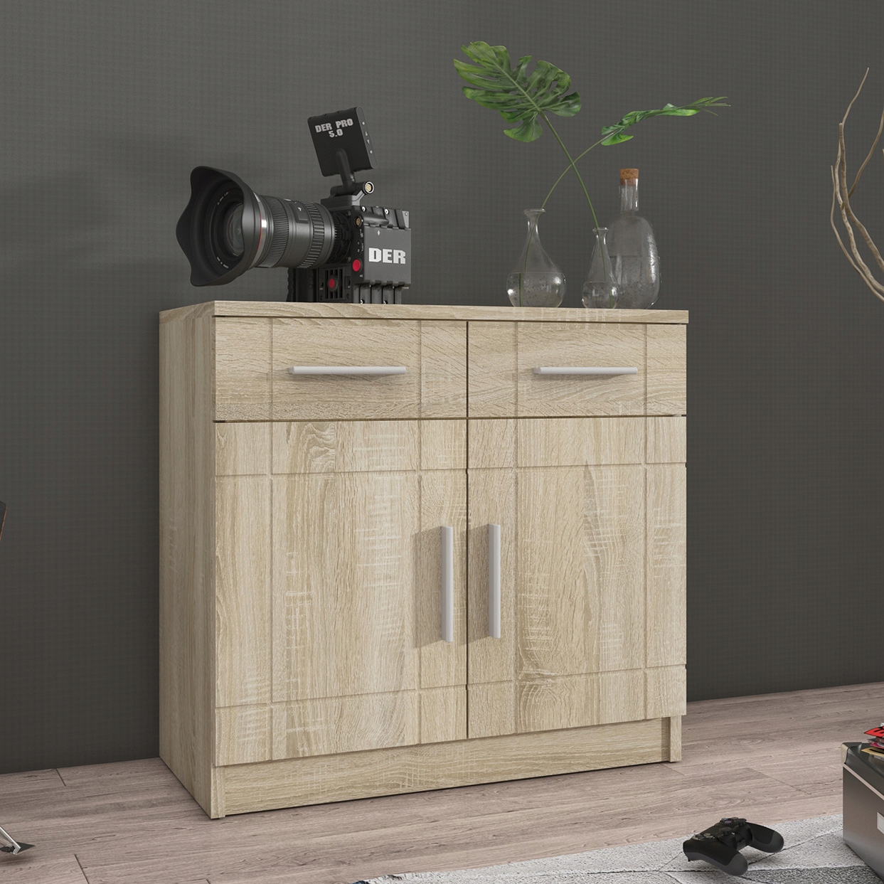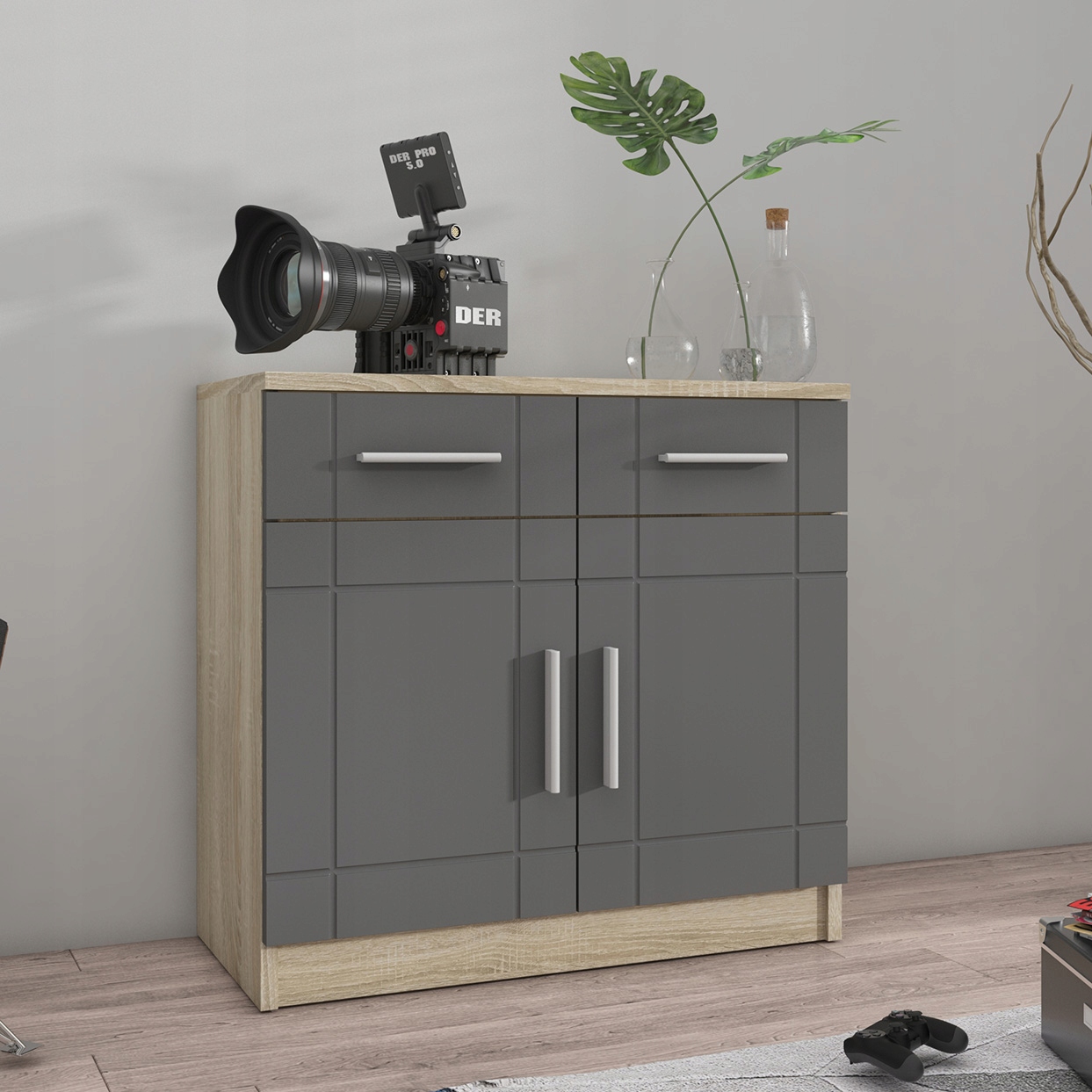 Komoda PELIO 2D dąb sonoma biała grafit do salonu pokoju kredens