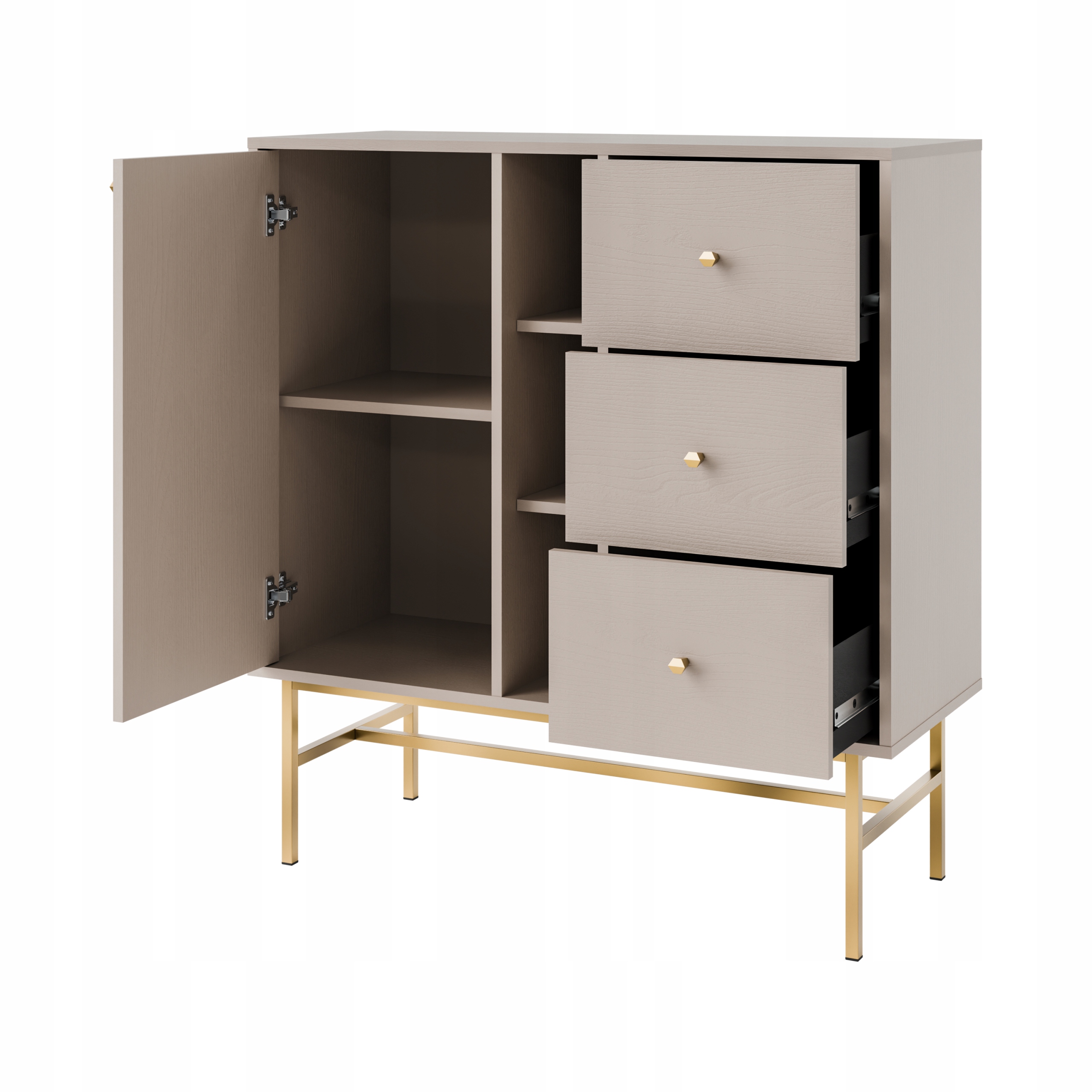 Mebel wyposażony jest w 3 szuflady, 1 frontową szafkę z półką oraz 3 wnęki, które mogą posłużyć również jako półki dekoracyjne.