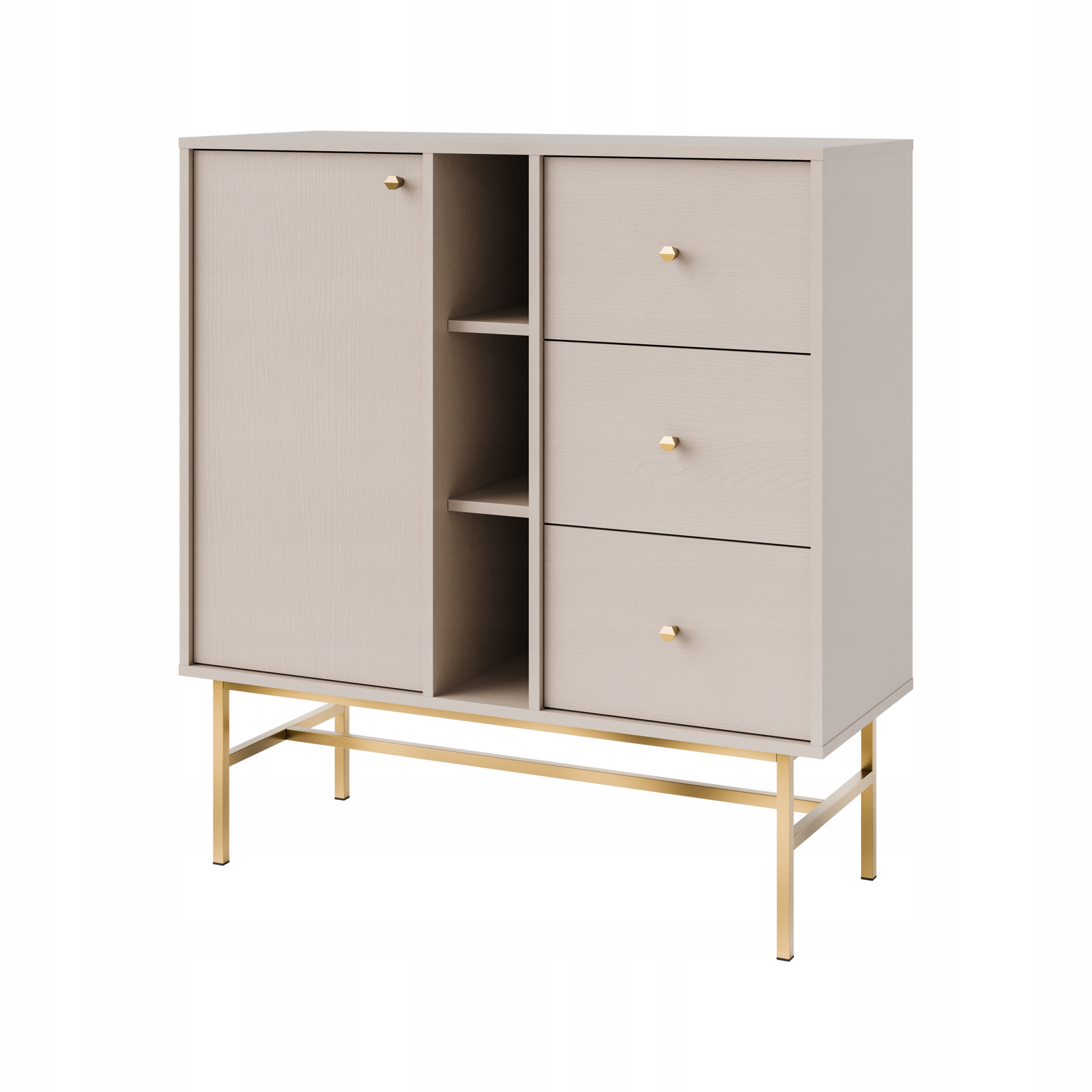 Całość osadzona jest na stelaż w złotym kolorze, który nadaje meblowi lekkości i luksusowego charakteru.