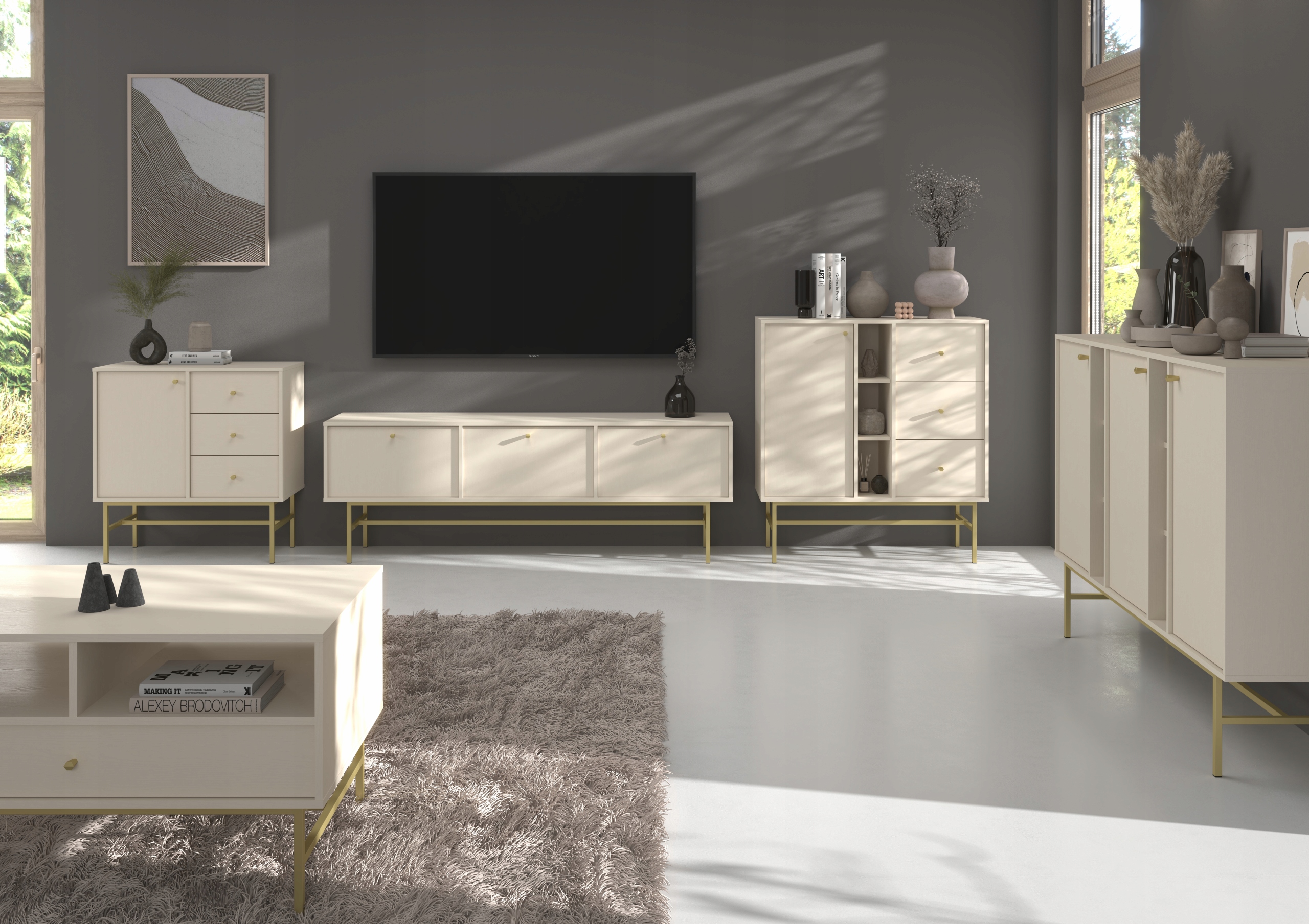 Nowoczesna komoda to elegancki i funkcjonalny mebel, który doskonale wpisuje się we współczesne aranżacje wnętrz. Utrzymana w jasnej, neutralnej kolorystyce prezentuje się lekko i subtelnie, a jej minimalistyczna forma podkreśla nowoczesny charakter.