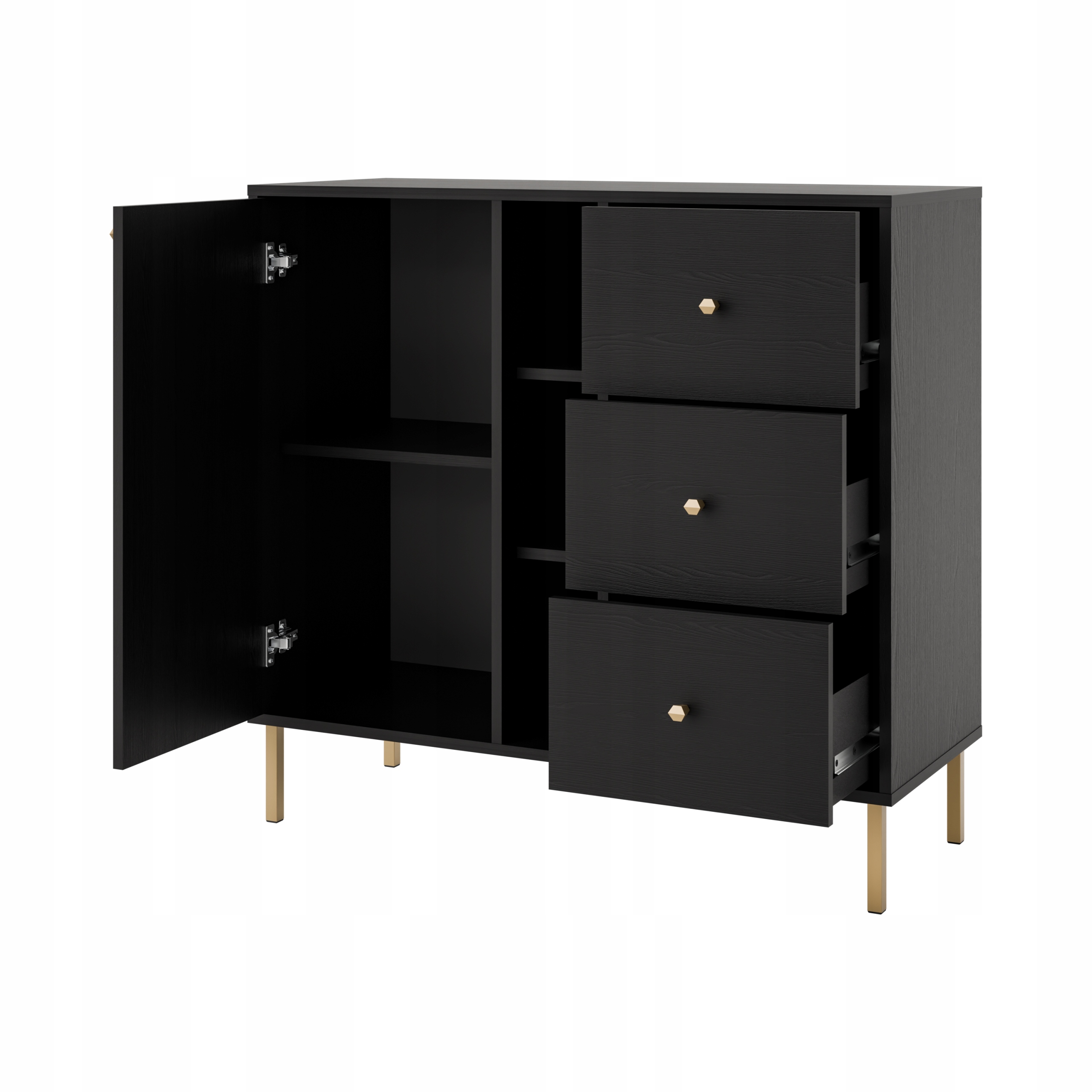 Mebel wyposażony jest w 3 szuflady, 1 frontową szafkę z półką oraz 3 wnęki, które mogą posłużyć również jako półki dekoracyjne.