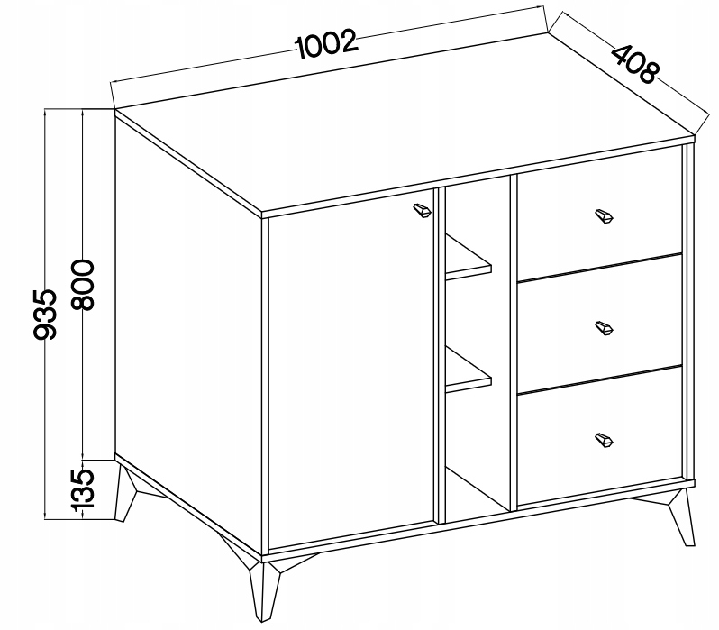 Mebel wyposażony jest w 3 szuflady, 1 frontową szafkę z półką oraz 3 wnęki, które mogą posłużyć również jako półki dekoracyjne.