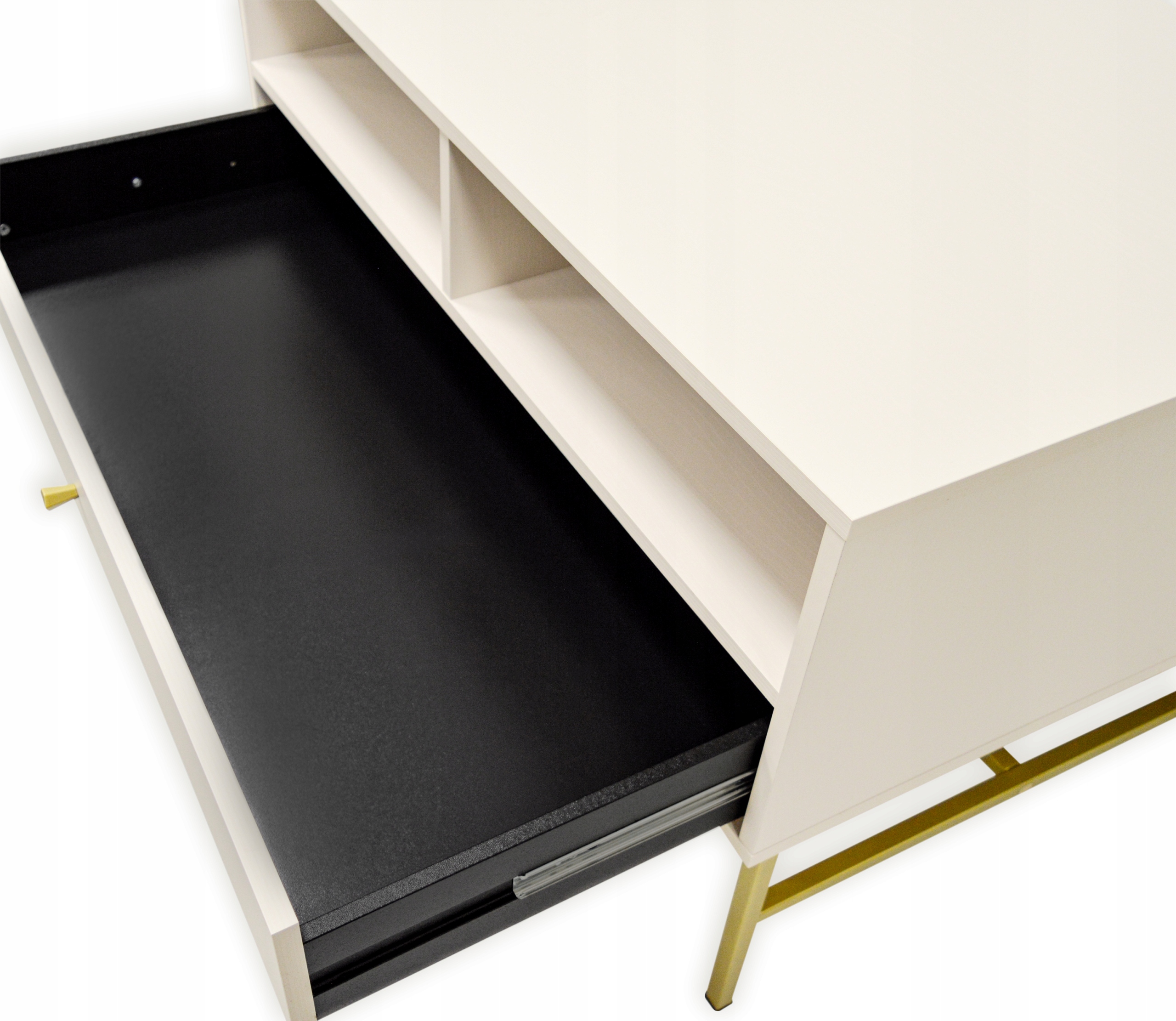 Całość osadzona jest na stylowych, smukłych nogach w złotym kolorze, które nadają meblowi lekkości i luksusowego charakteru.