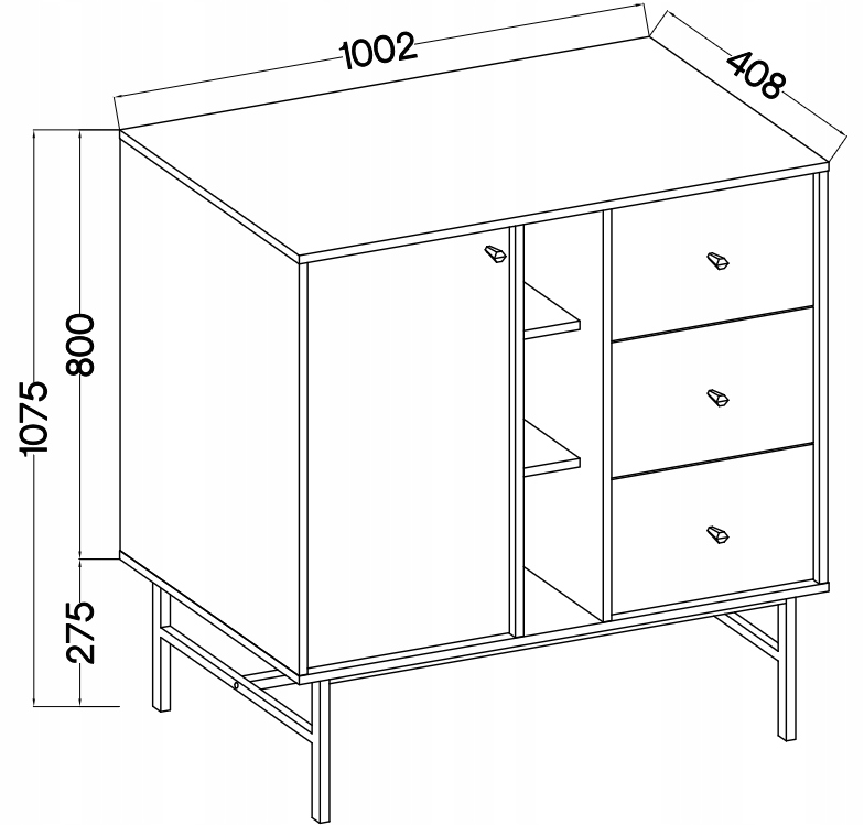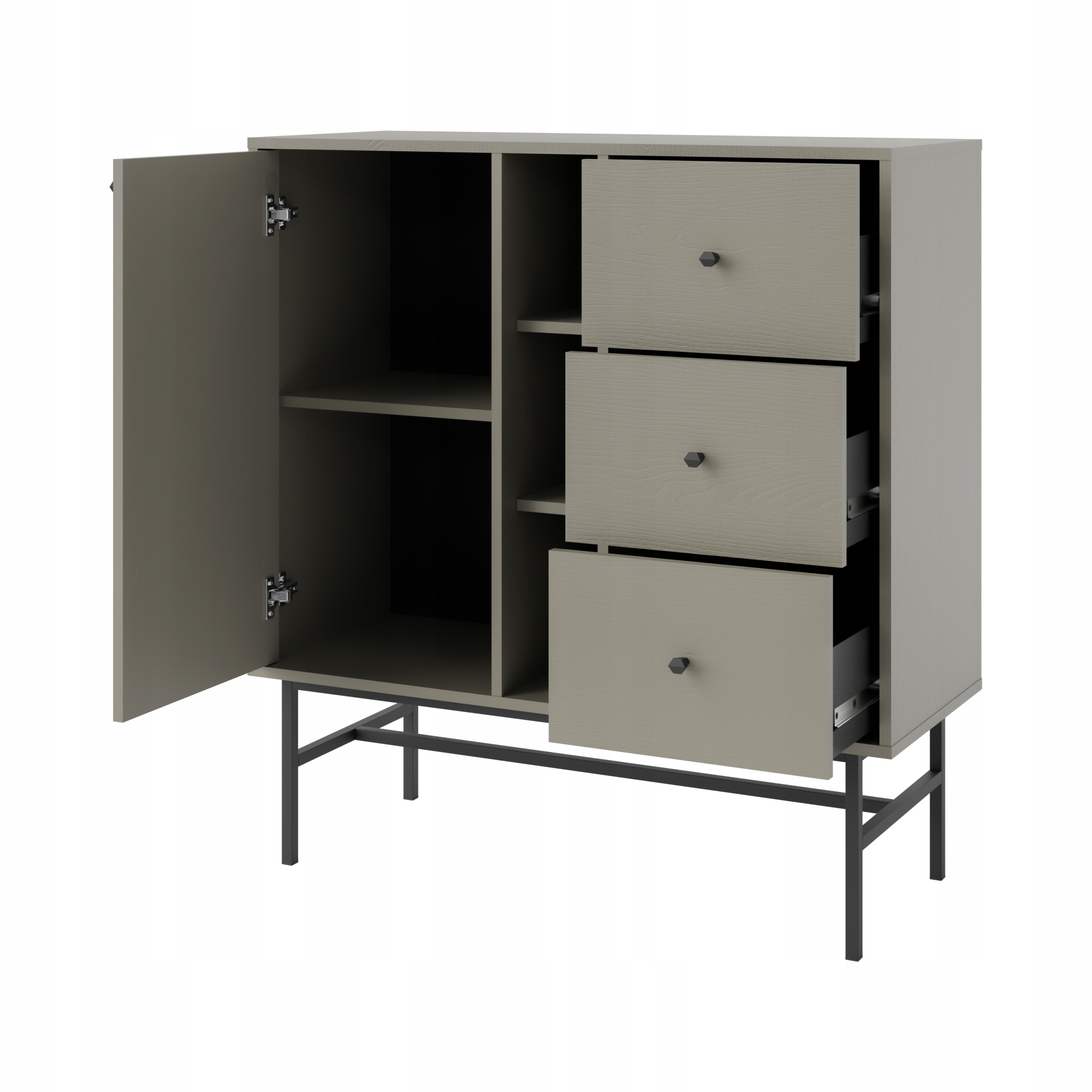 Mebel wyposażony jest w 3 szuflady, 1 frontową szafkę z półką oraz 3 wnęki, które mogą posłużyć również jako półki dekoracyjne.