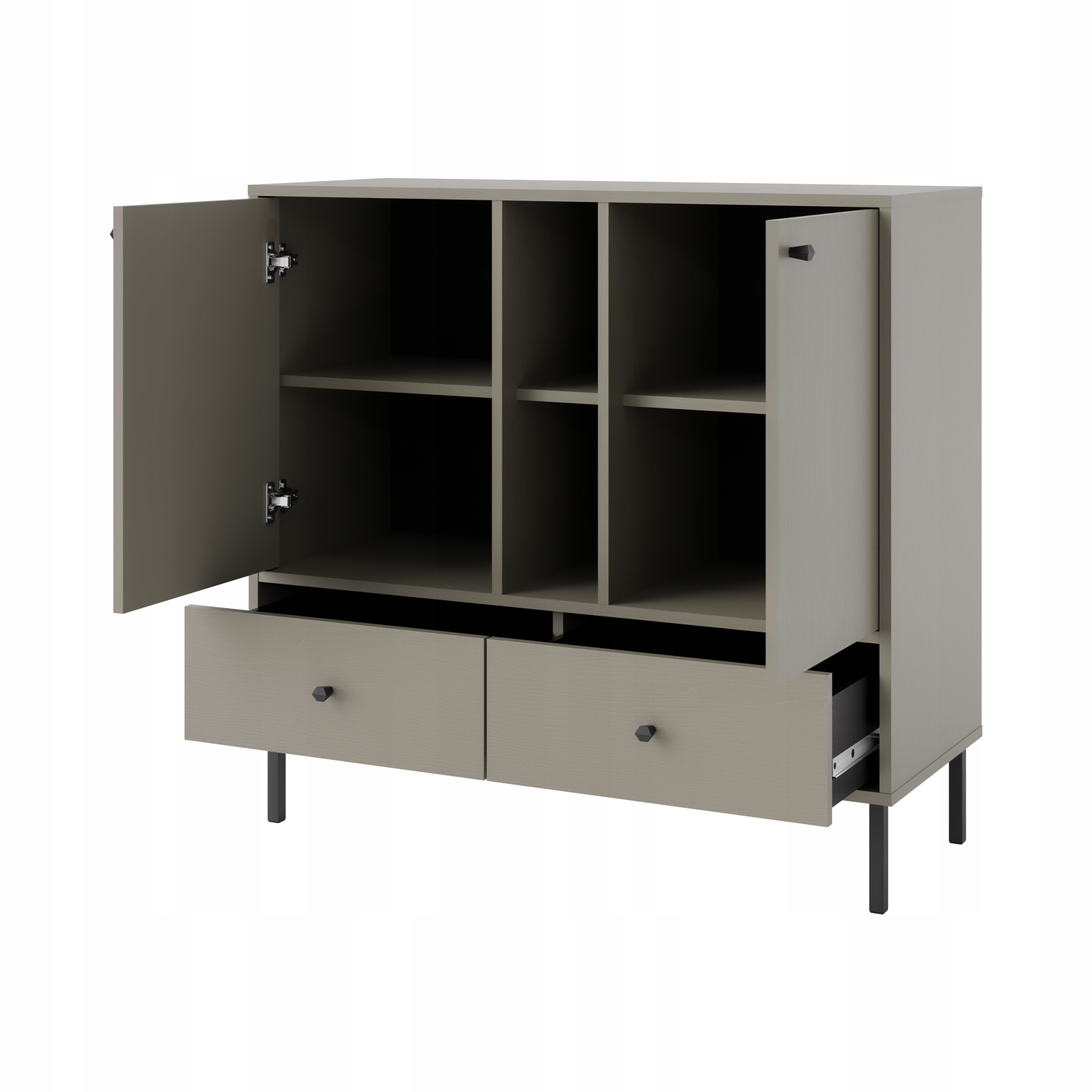 Mebel wyposażony jest w 2 szuflady, 2 frontowe szafki z półką oraz 2 wnęki, które mogą posłużyć również jako półki dekoracyjne.