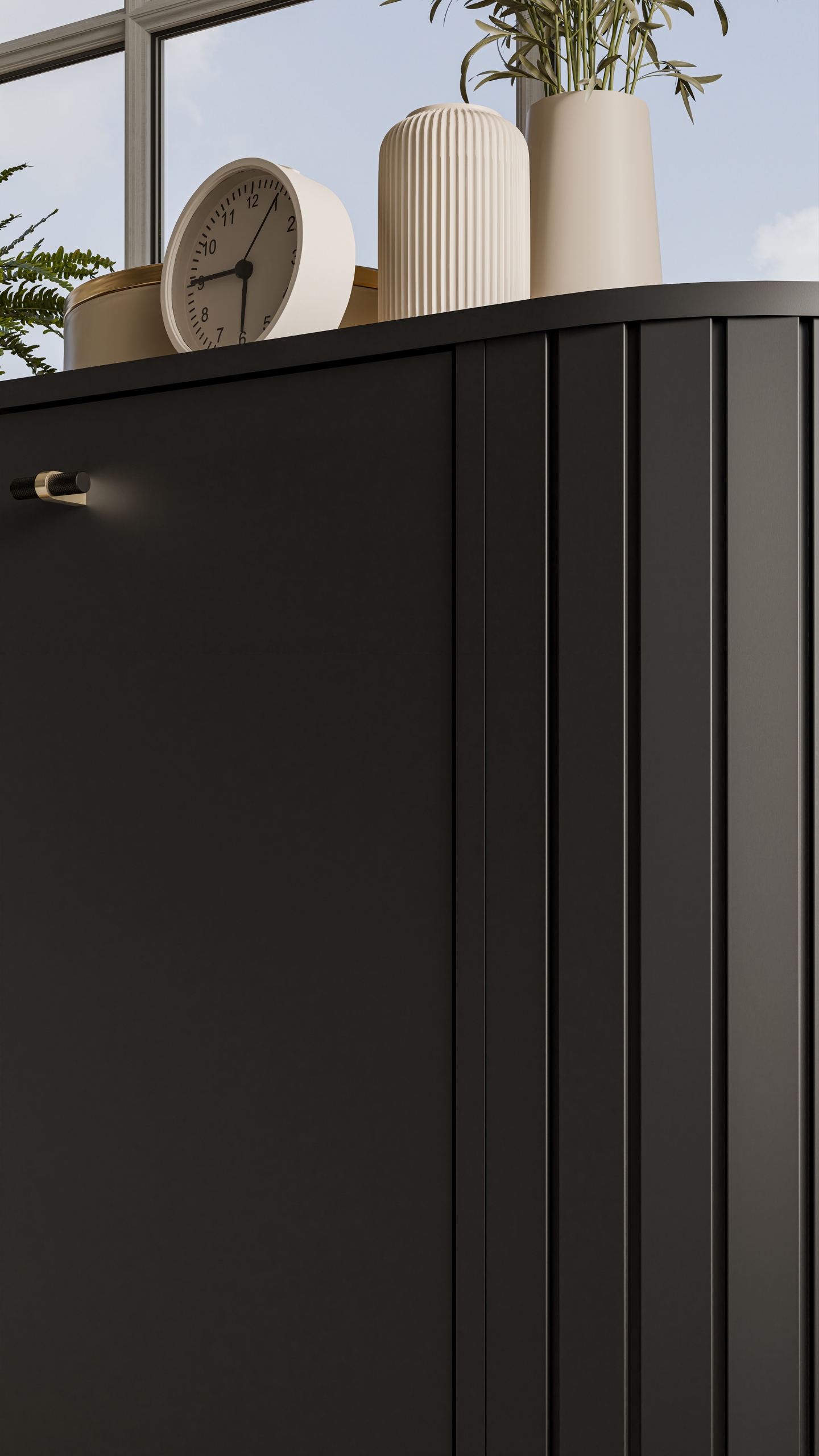Komoda z drzwiczkami to elegancki mebel o nowoczesnym charakterze, łączący funkcjonalność z estetycznym designem. Fronty o gładkiej powierzchni i zaokrąglonych krawędziach w połączeniu z pionowym frezowaniem boków tworzą spójną, harmonijną całość. Centralna część mebla posiada przeszkloną witrynę z czarną aluminiową ramką oraz wbudowanym oświetleniem LED, które efektownie podkreśla wyeksponowane przedmioty. Boczne szafki z pełnymi frontami zapewniają pojemną przestrzeń do przechowywania.