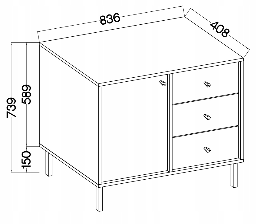 Mebel wyposażony jest w 3 szuflady oraz frontową szafkę z półką.