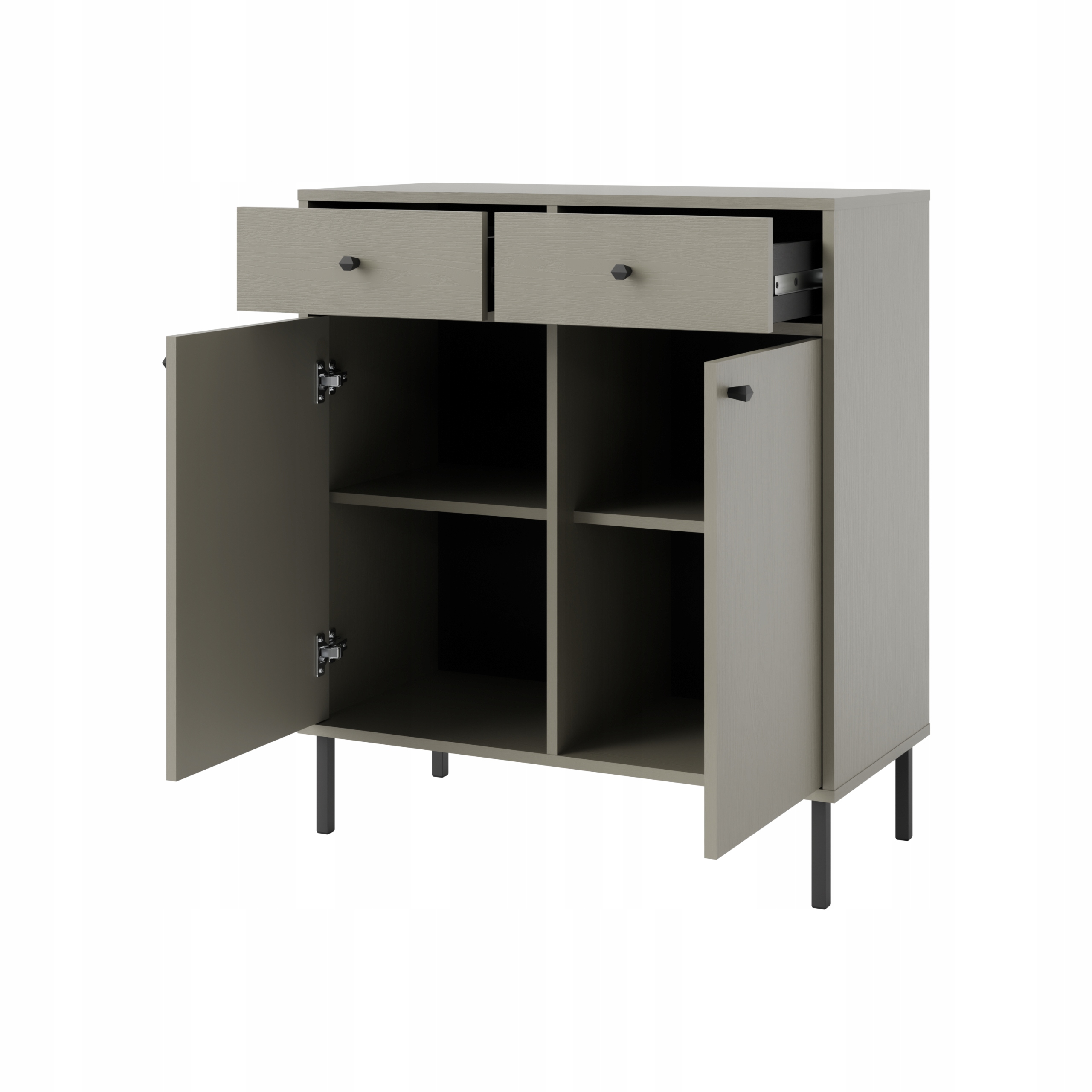 Mebel wyposażony jest w 2 szuflady oraz 2 frontowe szafki z półkami.