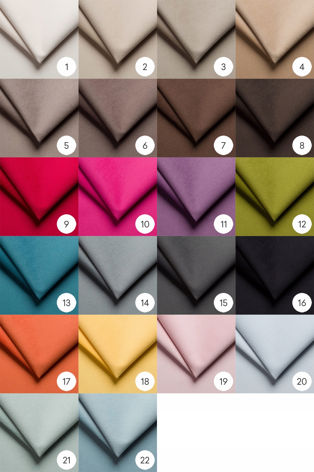 TRINITY - Popularna welurowa tkanina obiciowa. Jej cechą charakterystyczną jest delikatna struktura i powierzchnia pokryta drobnym meszkiem - w dotyku miękka i przyjemna. Cieszy się popularnością ze względu na subtelne, cieniowanie materiału oraz matowe kolory.