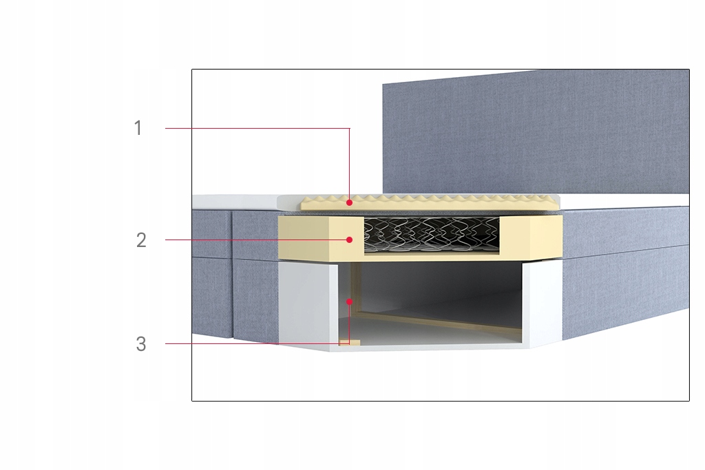 1️⃣ Materac nawierzchniowy (topper) – wykonany z pianki wysokoelastycznej, która zwiększa komfort snu. Topper jest antyalergiczny i stanowi skuteczną barierę ochronną przed grzybami oraz roztoczami.