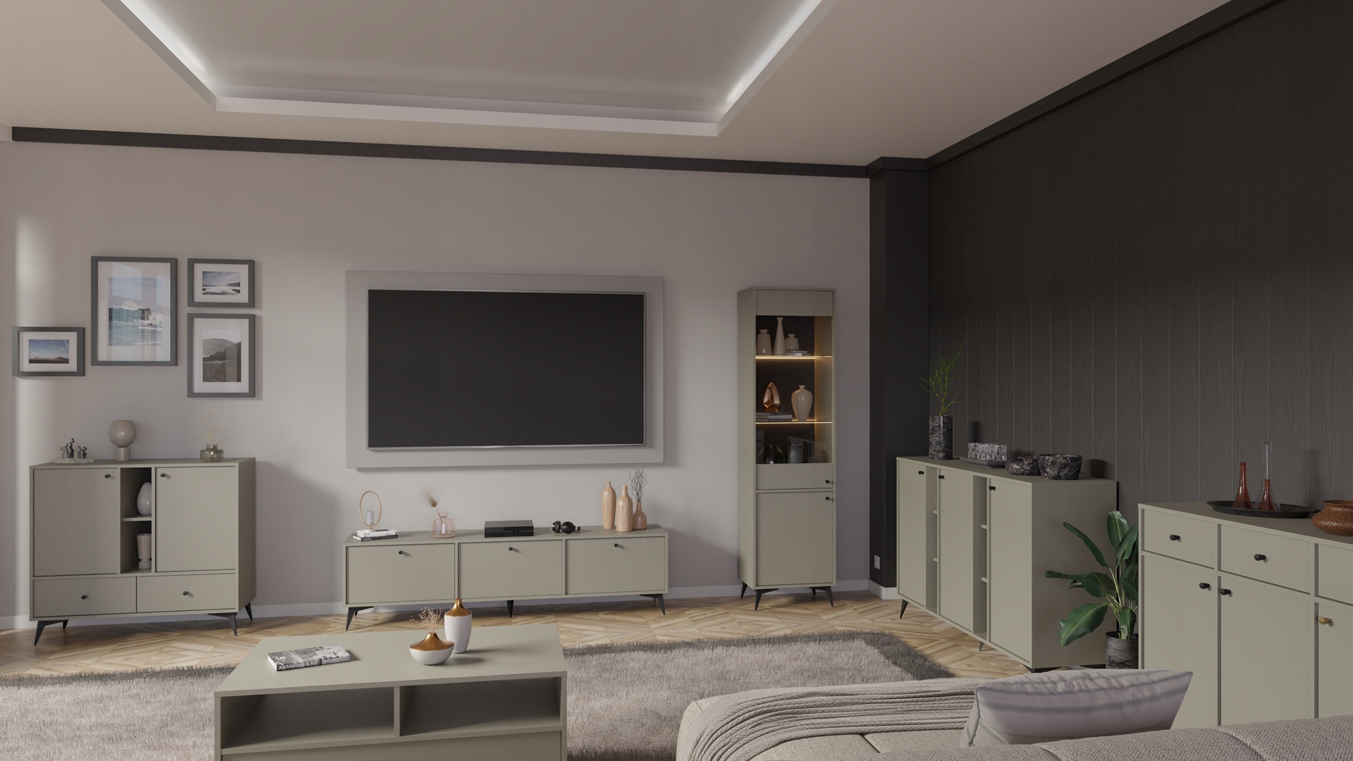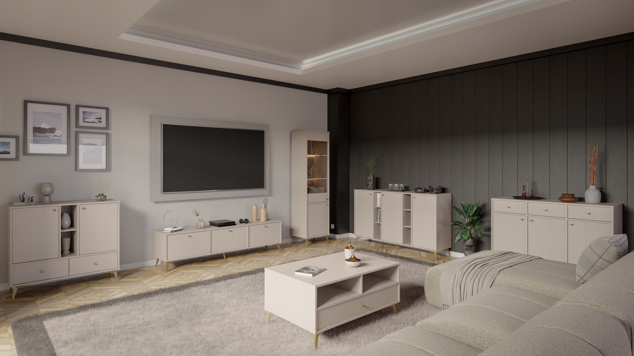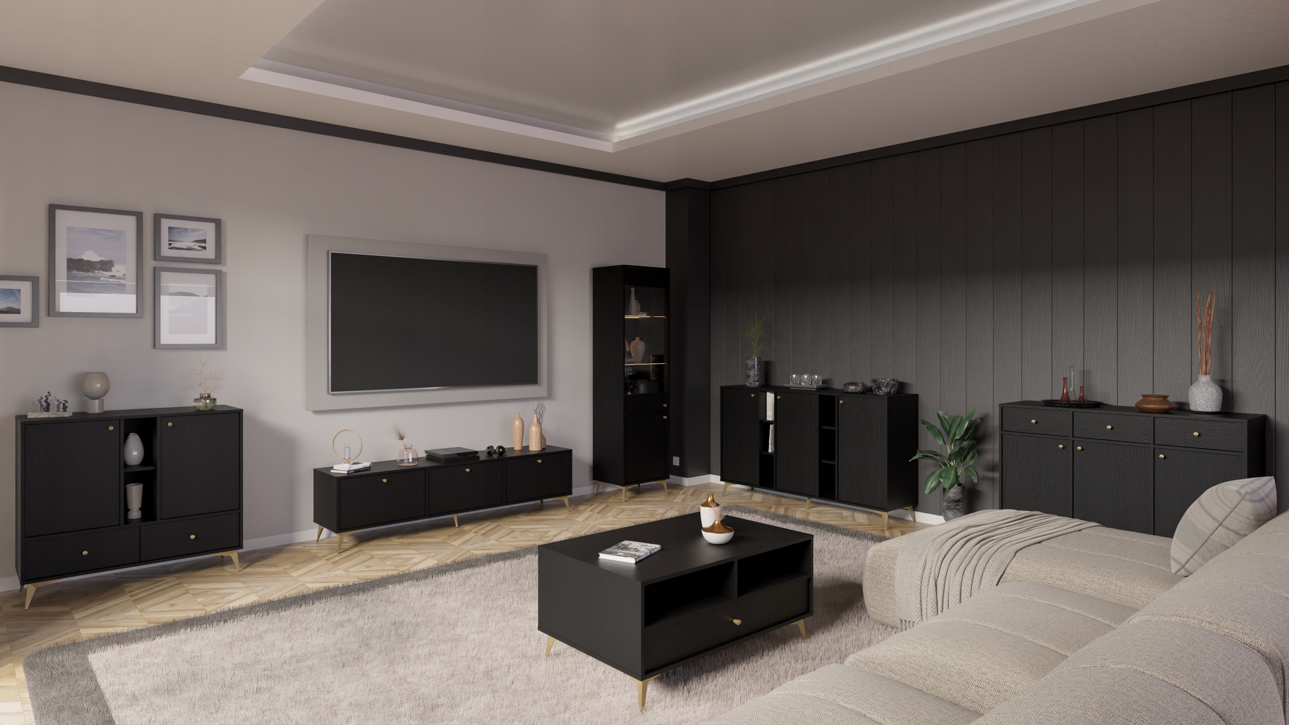 Całość osadzona jest na stabilnych, czarnych nogach o lekkiej formie, które nadają szafce wizualnej lekkości i ułatwiają utrzymanie porządku pod meblem.