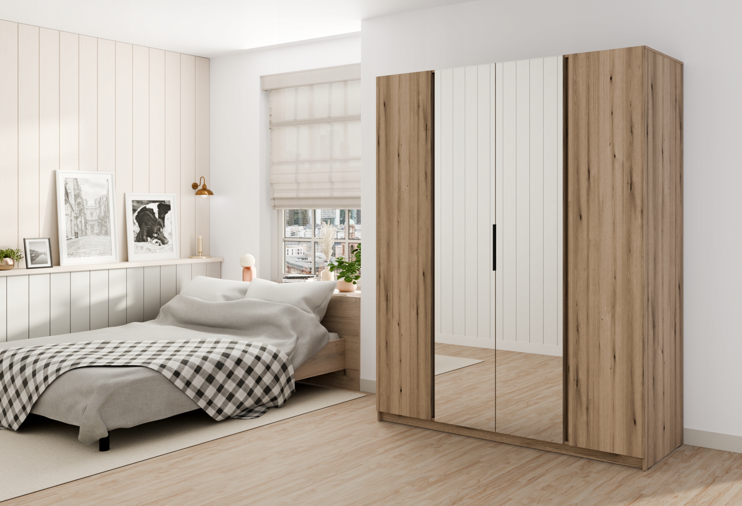 Nowoczesna szafa 4-drzwiowa to połączenie funkcjonalności i stylowego designu, które doskonale wpisze się w każde wnętrze. Przestronne wnętrze wyposażone jest w praktyczne półki, które umożliwiają wygodne przechowywanie ubrań, dodatków oraz drobnych przedmiotów. Solidna konstrukcja oraz nowoczesne wykończenie nadają meblowi elegancki i ponadczasowy charakter. Idealna do sypialni, garderoby czy przedpokoju — łączy w sobie funkcję praktyczną i estetyczną, tworząc idealne rozwiązanie dla osób ceniących porządek i nowoczesny styl.