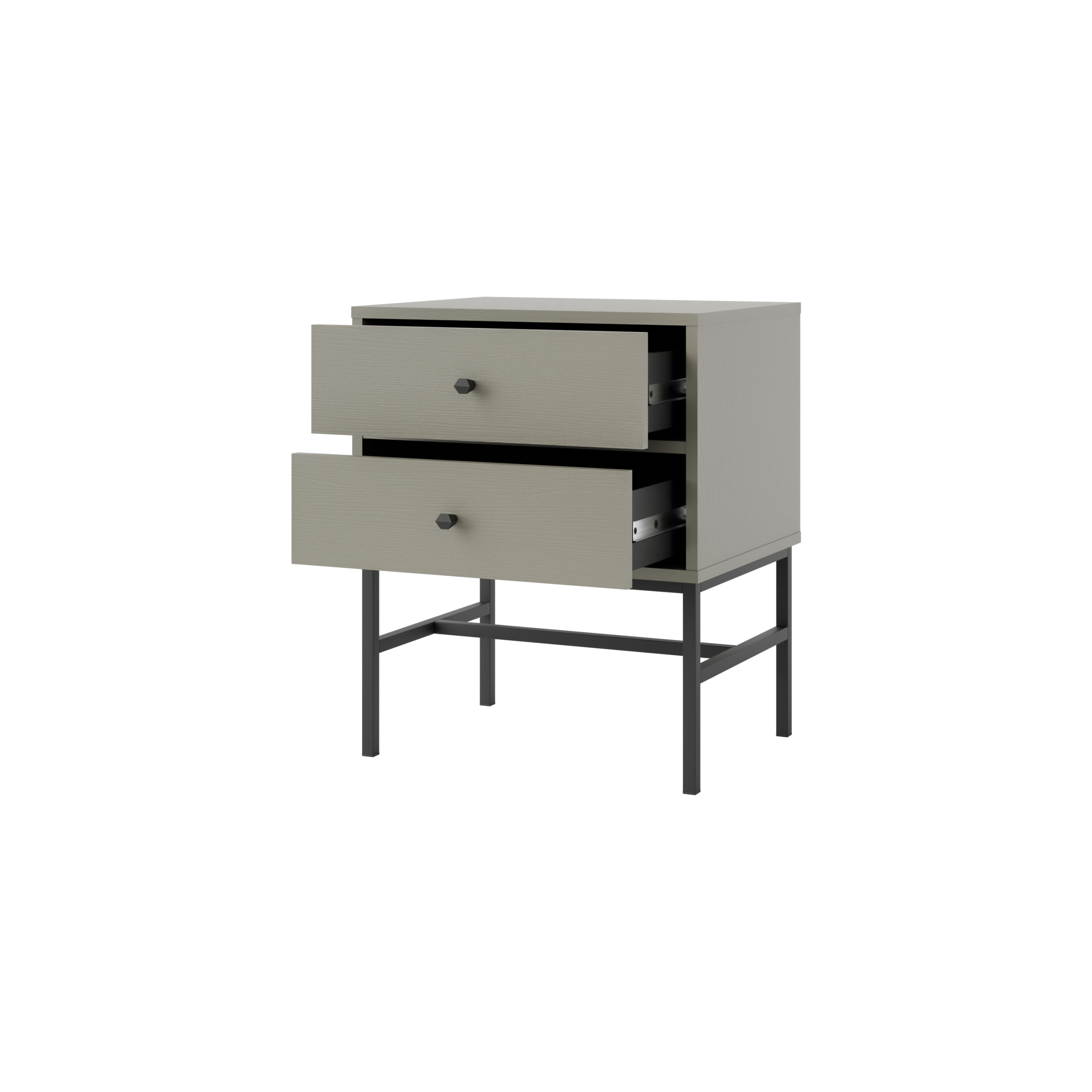 Całość osadzona jest na stelażu o lekkiej formie, który nadaje szafce wizualnej lekkości i ułatwiają utrzymanie porządku pod meblem.
