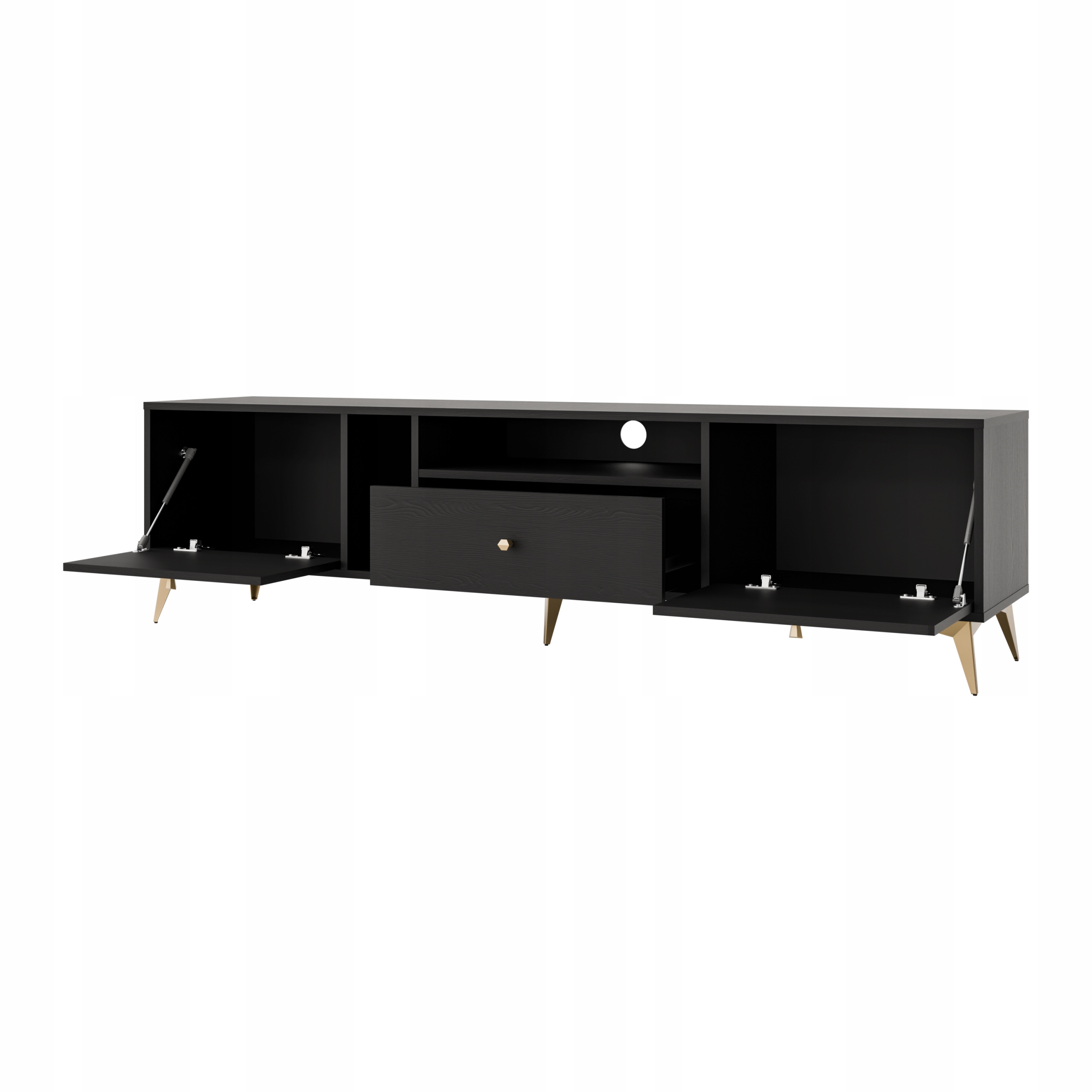 Mebel wyposażony jest w szufladę, wnęki i dwie pojemne, frontowe szafki otwierane do dołu, co zapewnia wygodny dostęp do wnętrza oraz umożliwia przechowywanie sprzętu RTV, akcesoriów lub innych domowych przedmiotów.
