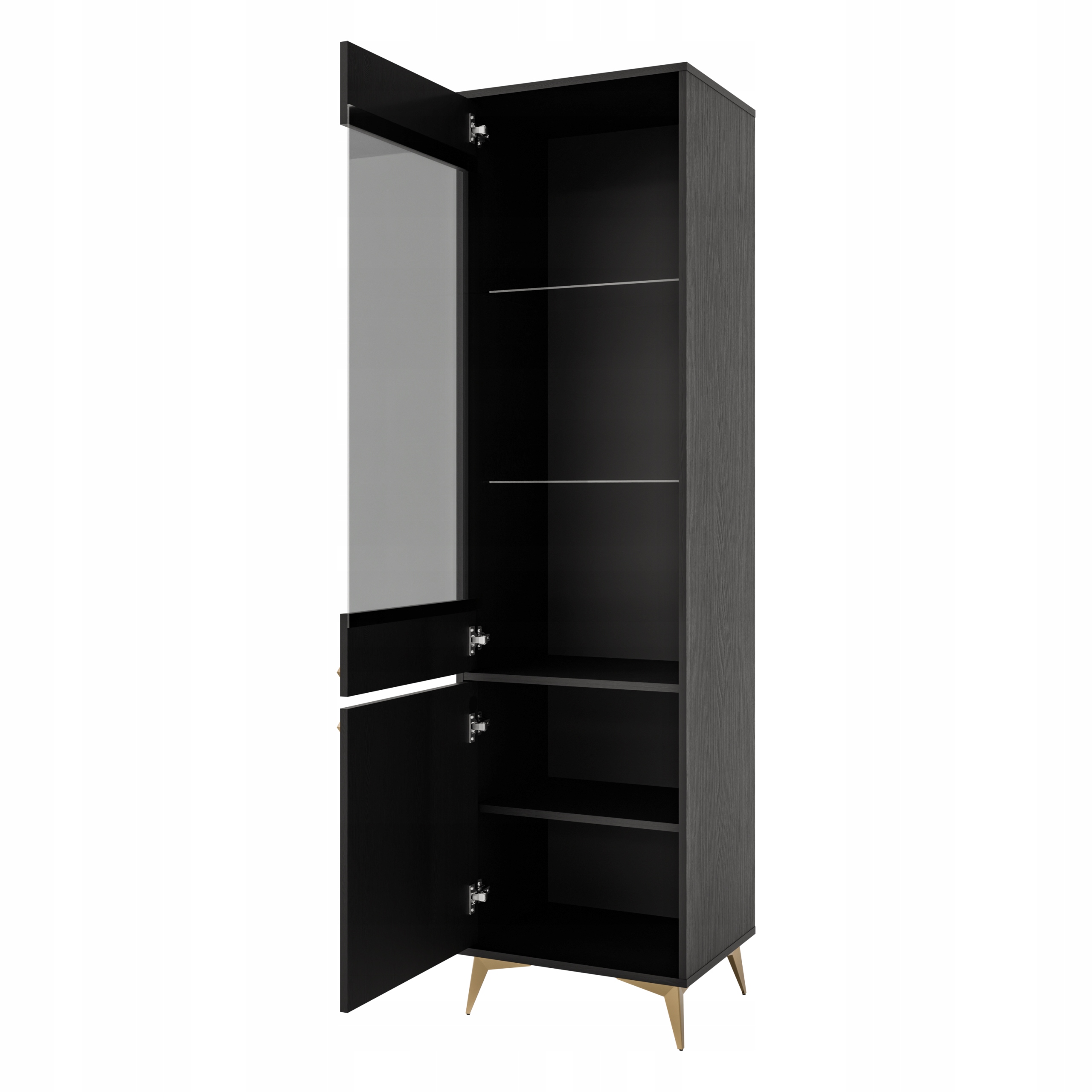 Nowoczesna witryna z jednym frontem szklanym i dodatkowymi drzwiczkami oraz oświetleniem LED to idealne połączenie estetyki i praktyczności. Jej smukła, minimalistyczna forma doskonale wpisuje się w aranżacje nowoczesne oraz klasycznie eleganckie, wprowadzając do wnętrza lekkość i uporządkowany charakter.