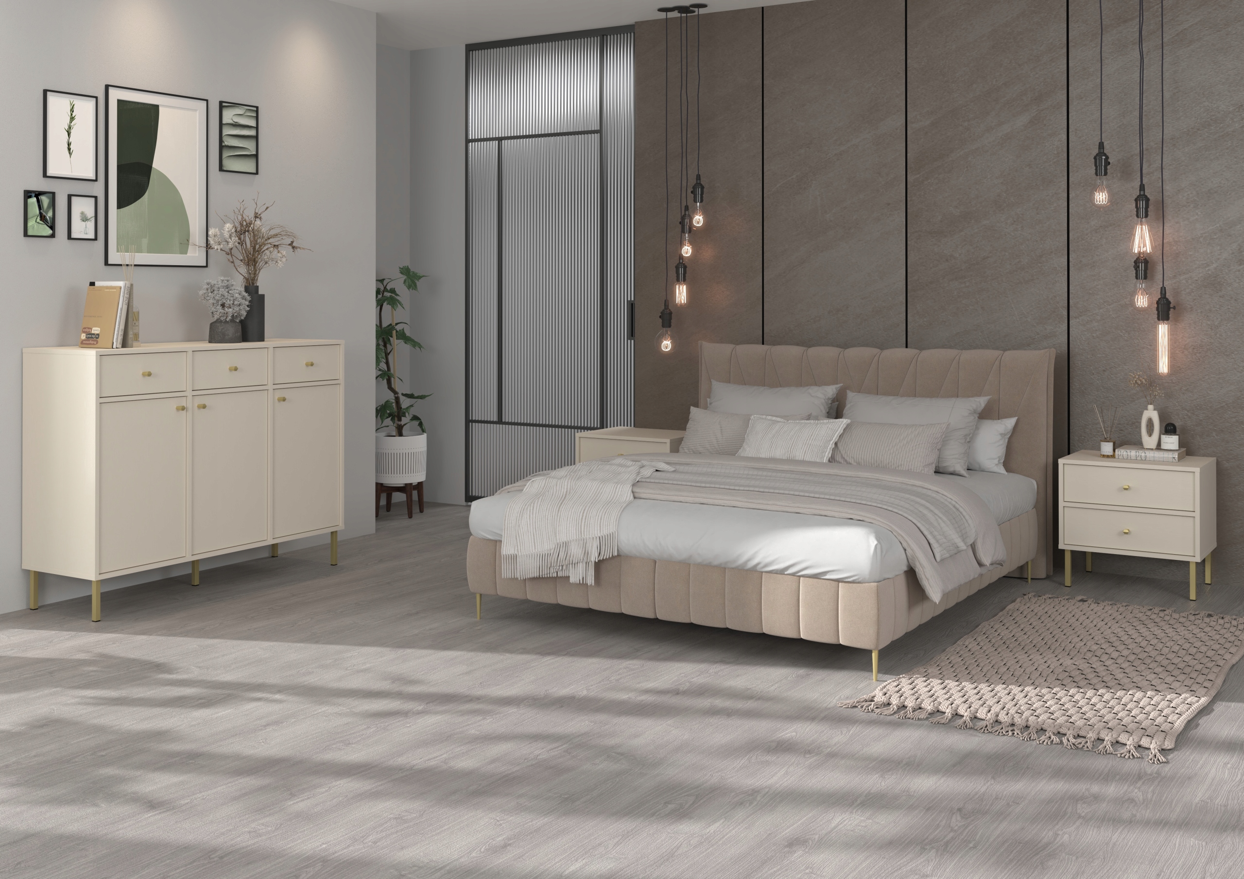 Całość osadzona jest na stabilnych, złotych nogach o lekkiej formie, które nadają szafce wizualnej lekkości i ułatwiają utrzymanie porządku pod meblem.