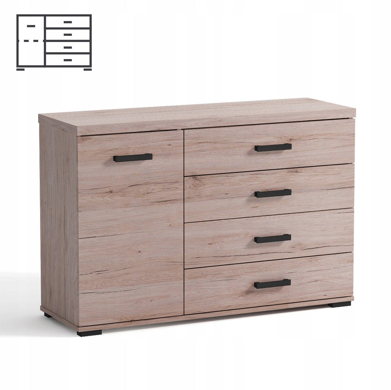 Zestaw składa się z następujących elementów: komody K03, półki wiszącej K12, ławy K11, witryny K09 oraz komody K02.