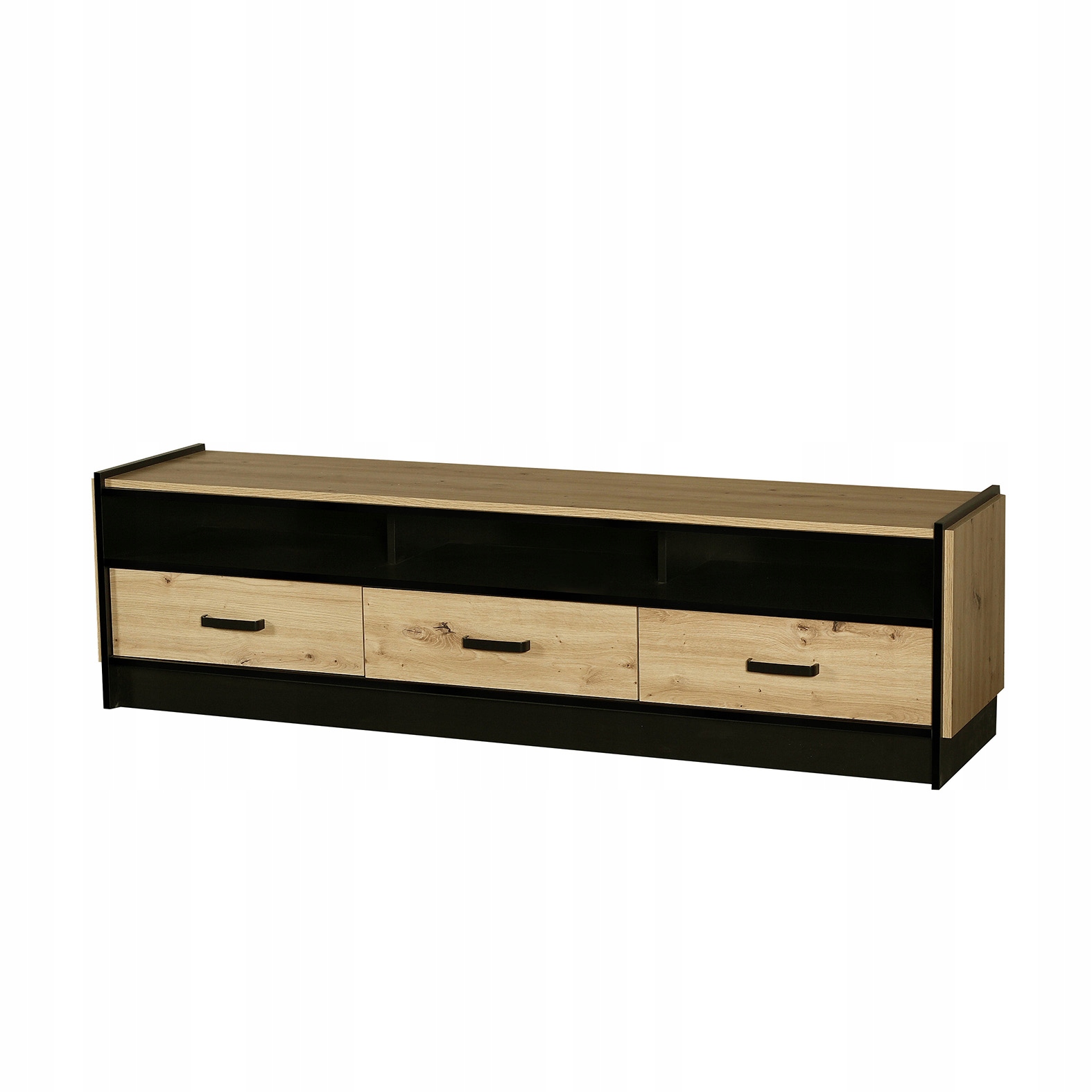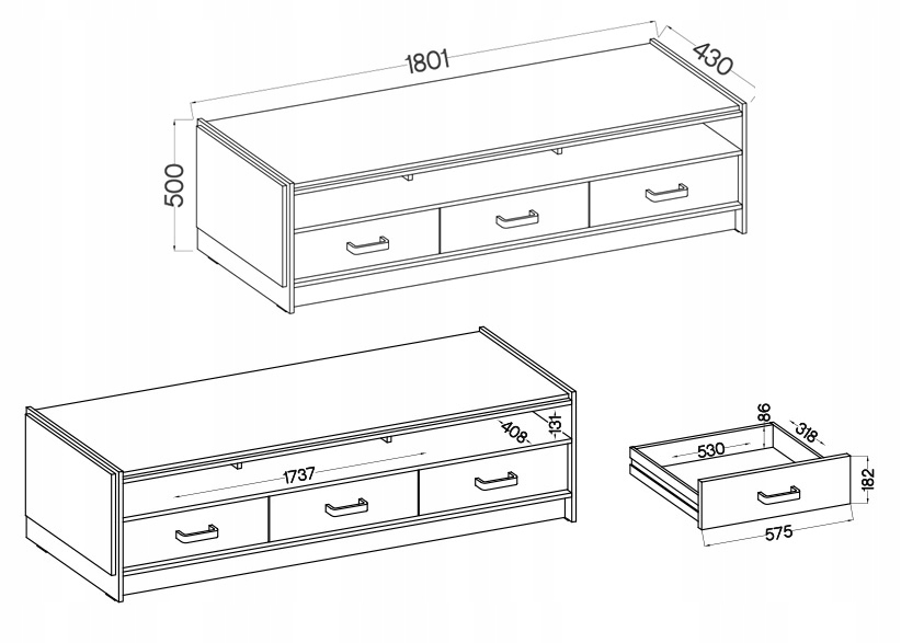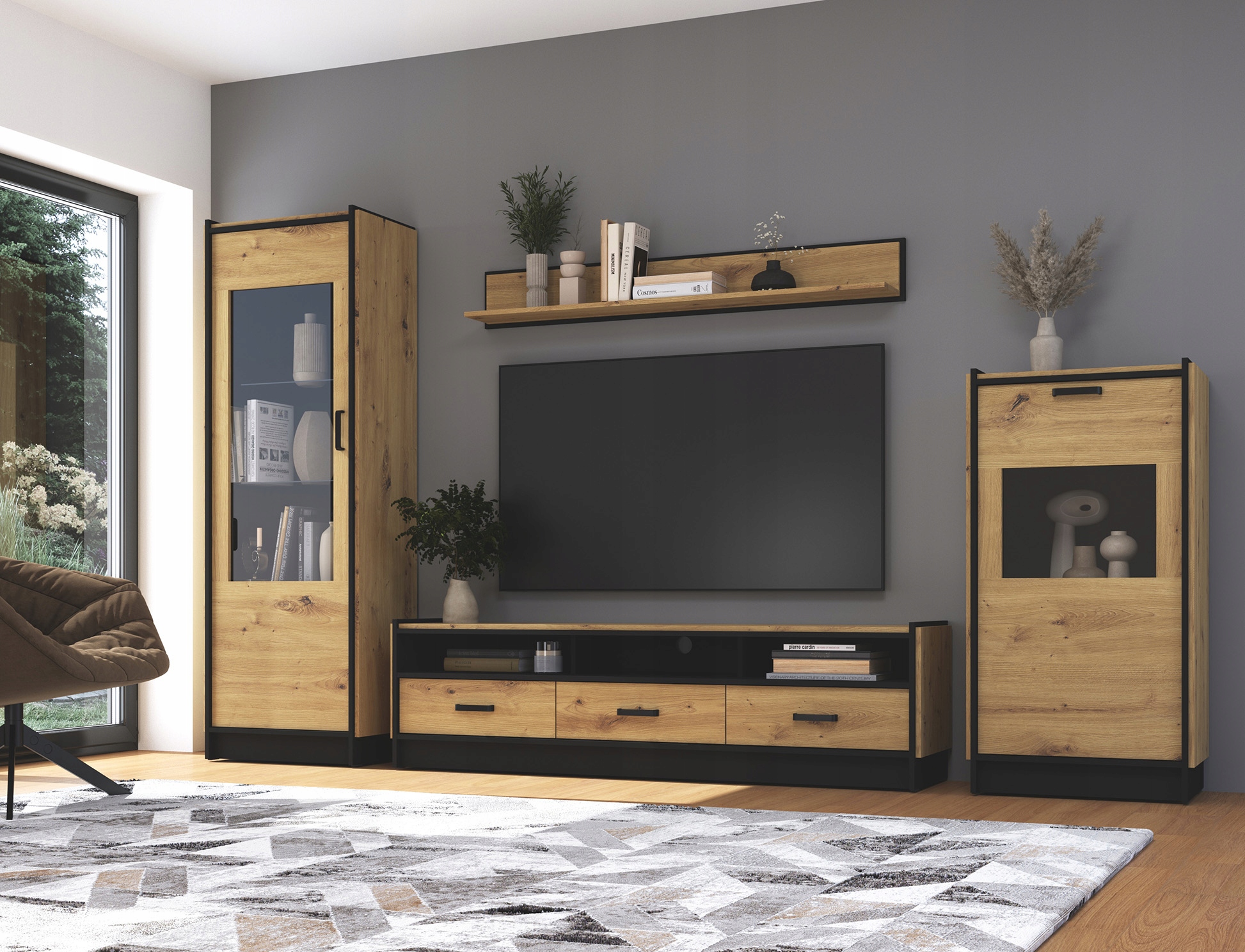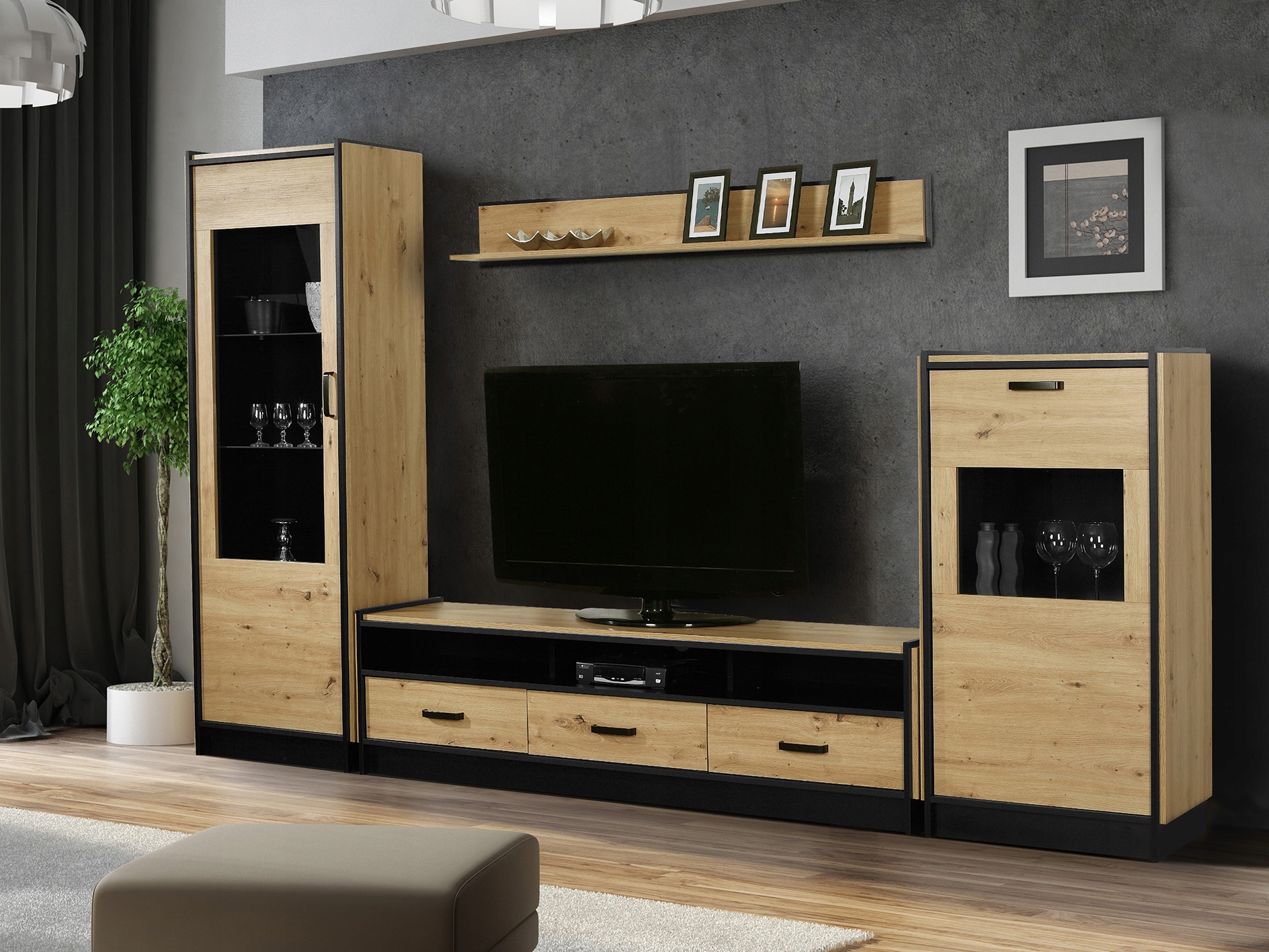Zestaw składa się z szafki RTV, półki wiszącej oraz dwóch witryn.