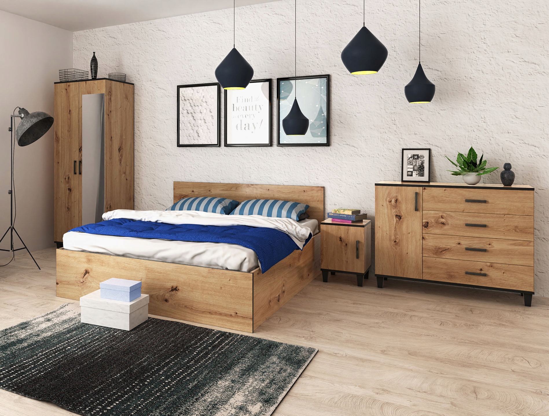 Zestaw mebli PINNO 4 do sypialni pokoju Dąb Artisan komoda szafa łóżko