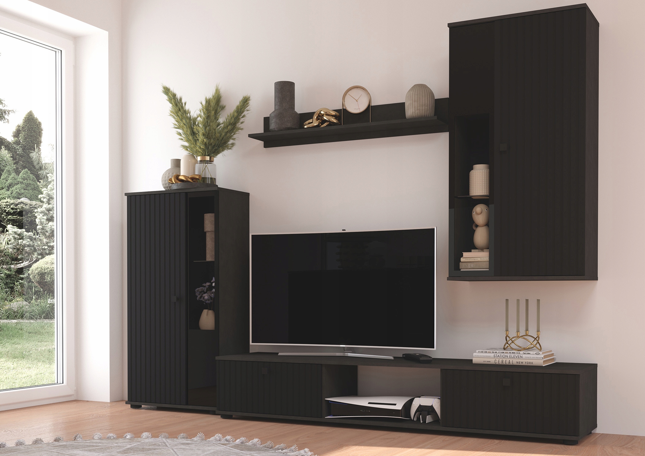 Zestaw składa się z szafki RTV, półki wiszącej oraz dwóch witryn.