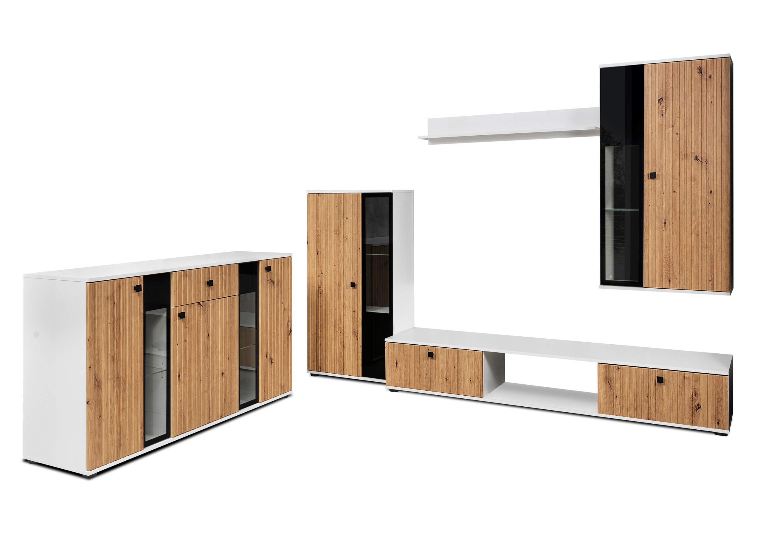 Zestaw składa się z komody, szafki RTV, półki wiszącej oraz dwóch witryn.