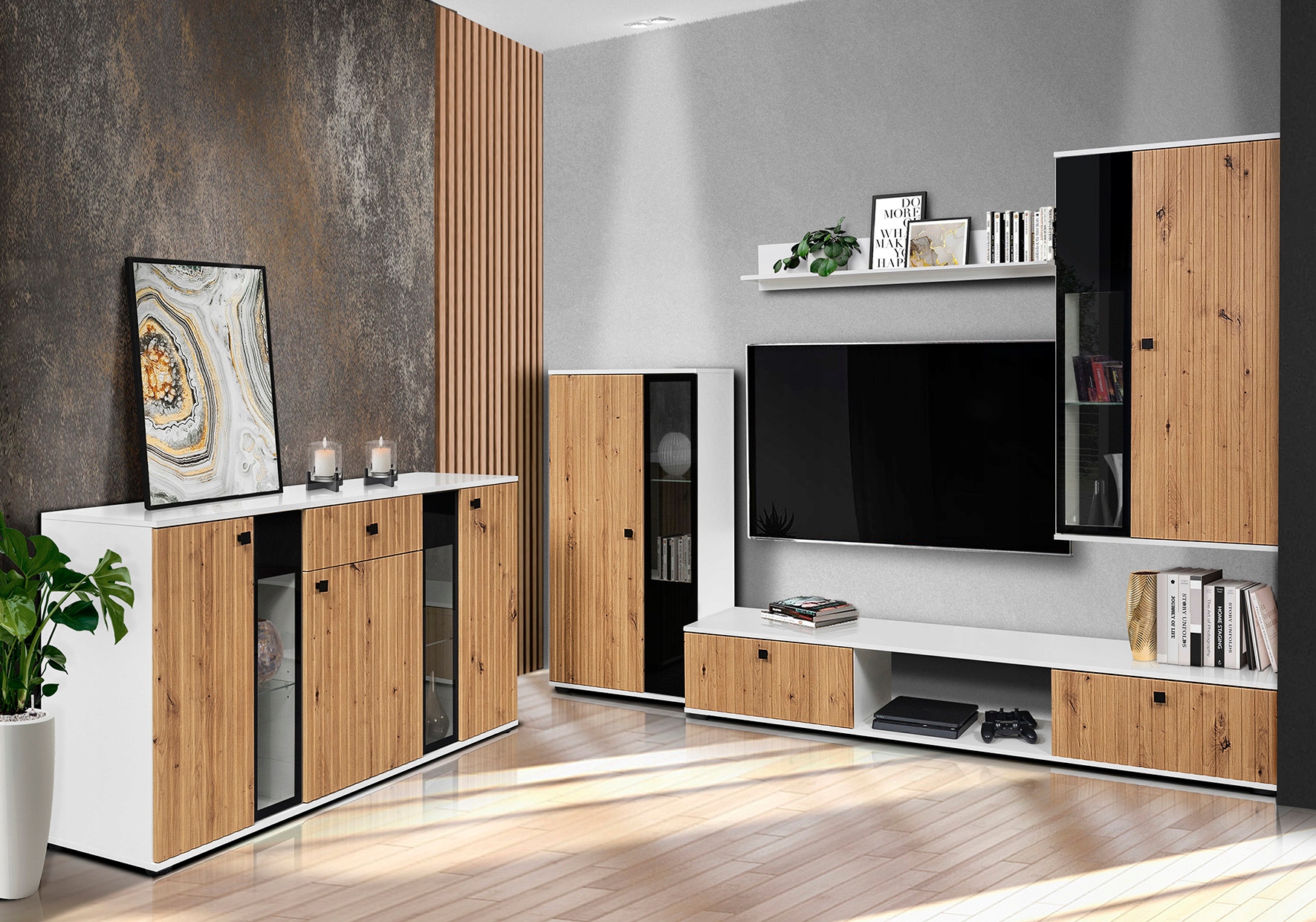 Zestaw składa się z komody, szafki RTV, półki wiszącej oraz dwóch witryn.