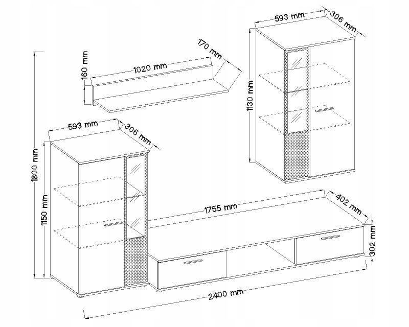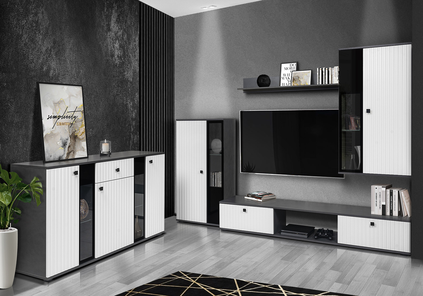 Zestaw składa się z komody, szafki RTV, półki wiszącej oraz dwóch witryn.