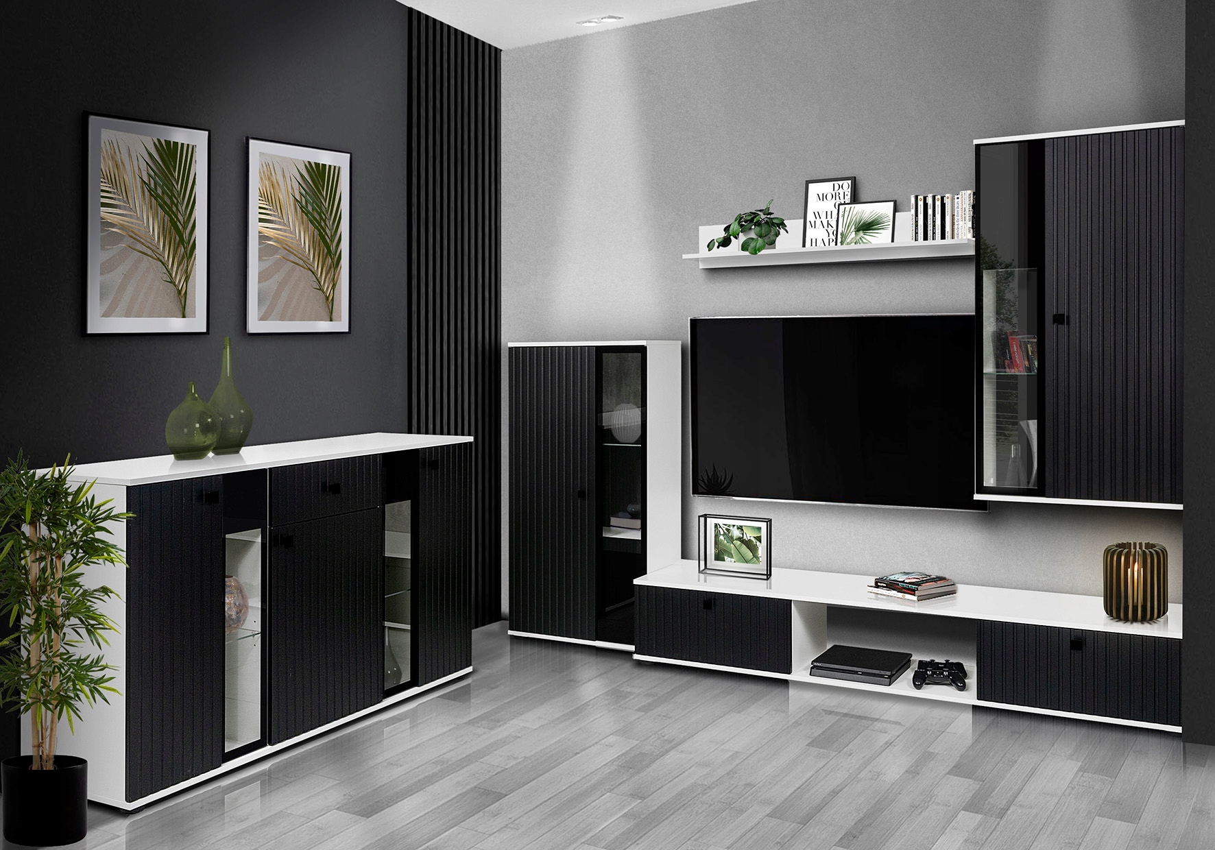 Zestaw składa się z komody, szafki RTV, półki wiszącej oraz dwóch witryn.
