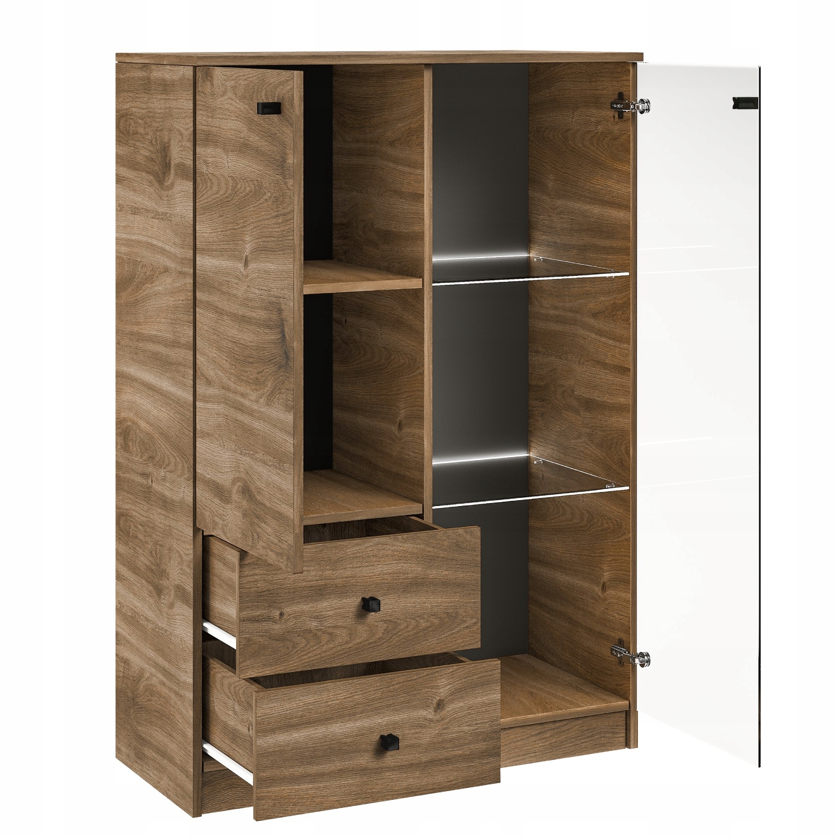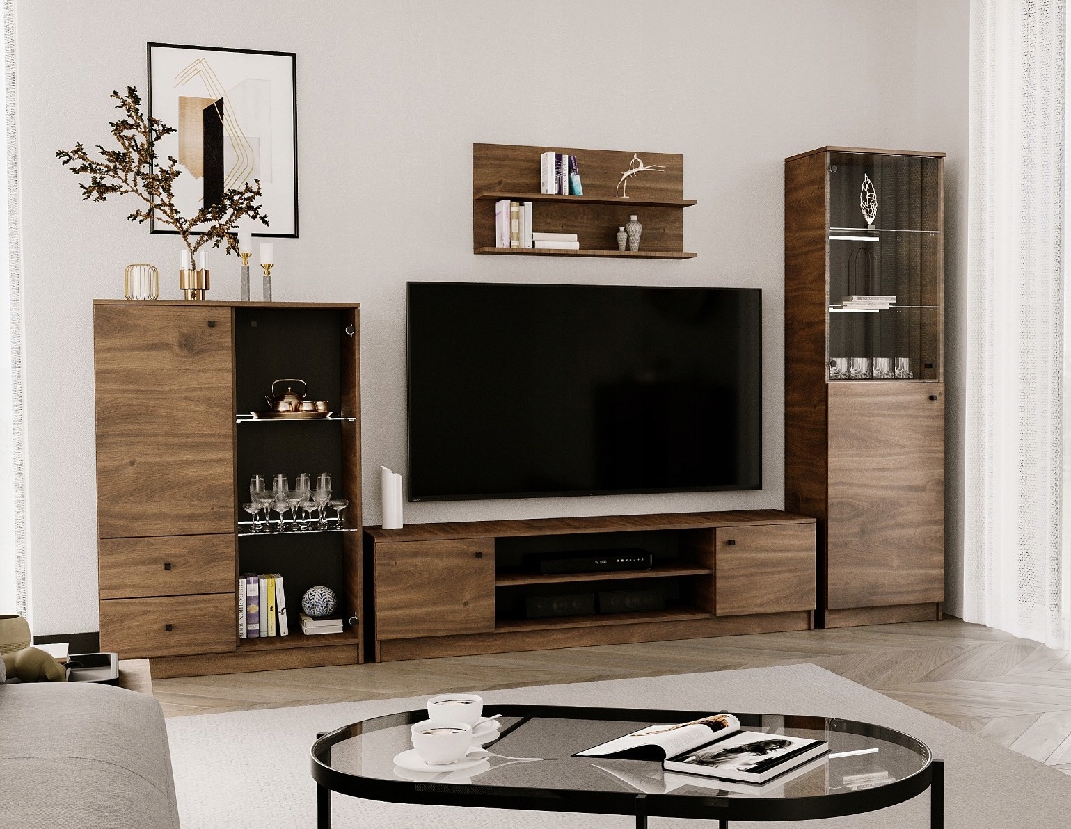 Zestaw składa się z następujących elementów: witryny przeszklonej W02, szafki RTV W06b, półki wiszącej W08 oraz witryny przeszklonej W07.